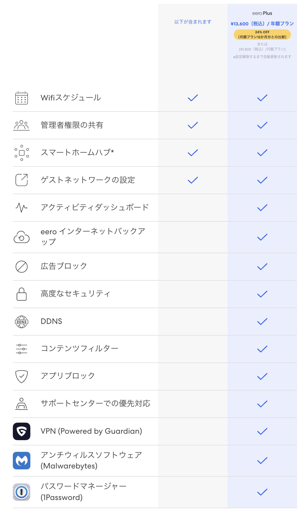 (6)利用中も安心:利用開始後もネットワークセキュリティーに関する継続的なアップデートが提供されます。さらに別途有料のサブスクリプションサービスのeero Plusを契約すると、高度なオンラインセキュリティー機能やペアレンタルコントロール(コンテンツフィルターや特定のアプリへのアクセスのブロックなど)、パスワード管理の「1Password」、マルウェア保護の「Malwarebytes」、DNSFilter社が提供するVPN機能「Guardian」、Webサイト閲覧時に出てくるポップアップなど一部の広告をブロックする機能といったプレミアムサービスの利用も可能になります。