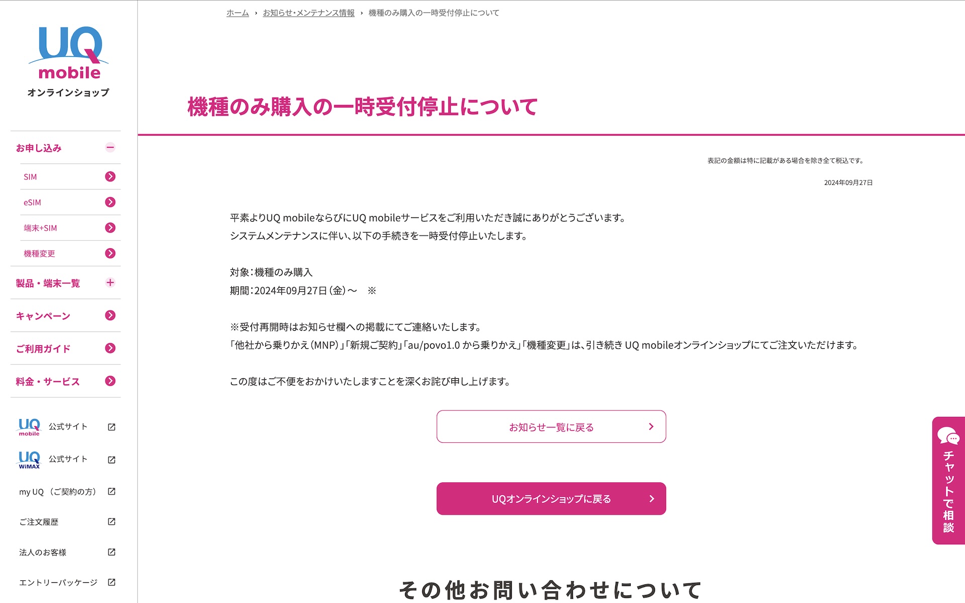 | UQ mobile オンラインショップで機種のみ購入が9月27日から一時受付停止! |
