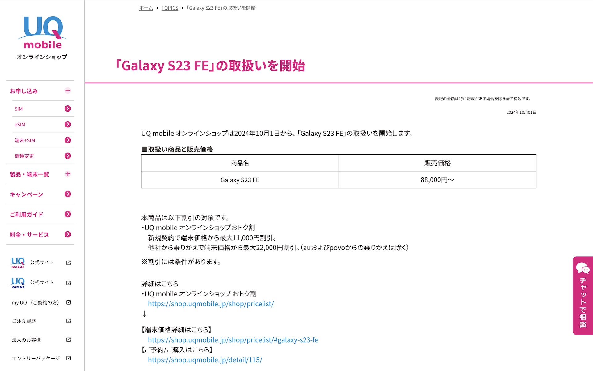 KDDIおよび沖縄セルラー電話は1日、携帯電話サービス「UQ mobile」において5G対応スマートフォン(スマホ)「Galaxy S23 FE(型番:SCG24)」(Samsung Electronics製)を取り扱うとお知らせしています。発売日は2024年10月1日(火)で、すでに公式Webストア「