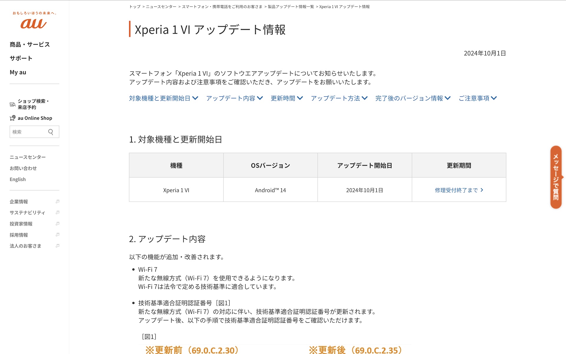 ・Xperia 1 VI アップデート情報 | 製品アップデート情報 | au