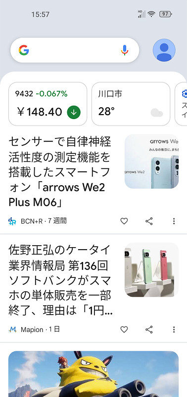続いてホーム画面を見てみましょう。Jelly Maxのホーム画面はGoogle Discover + 通常のホーム画面1面の全2面構成で、配置されているアプリもカメラ以外はGoogle製のGMS(Google Mobie Service)アプリのみとなっています。