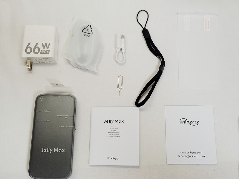 それでは早速、開封の議を執り行い、Jelly Maxとその同梱品を確認してみましょう。内容物としてはJelly Max本体・USB充電器・USB Type-Cケーブル・USB Type-C→3.5mmイヤホンジャック変換アダプタケーブル・ハンドストラップ・SIMピン・画面保護フィルム(予備)・ユーザーガイド・保証書となっています。また、Jelly Max本体にはあらかじめ画面保護フィルムとTPU製のクリアタイプの本体カバーが取り付けられています。
