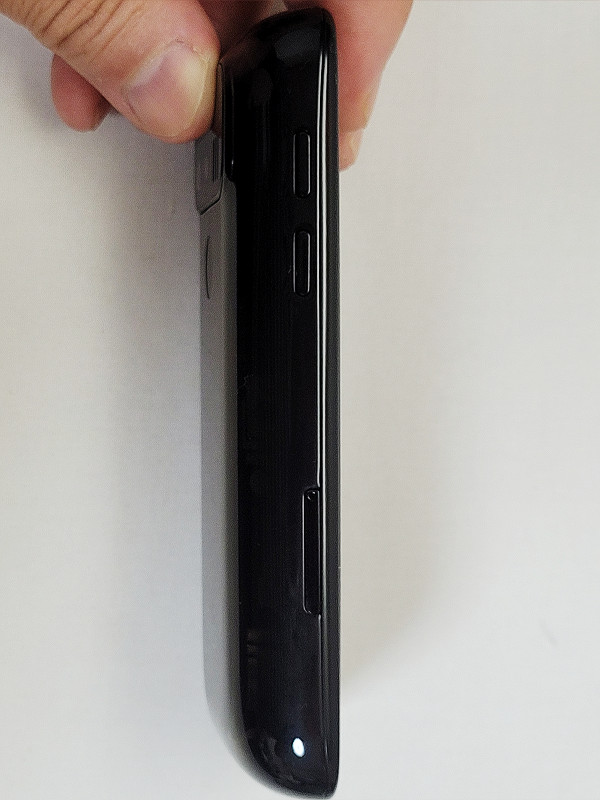 左側面には+と-が独立したタイプの音量キーとSIMおよびメモリーカードスロットがあり、右側面には電源キーとプログラマブルキー(赤いキー)があります。
