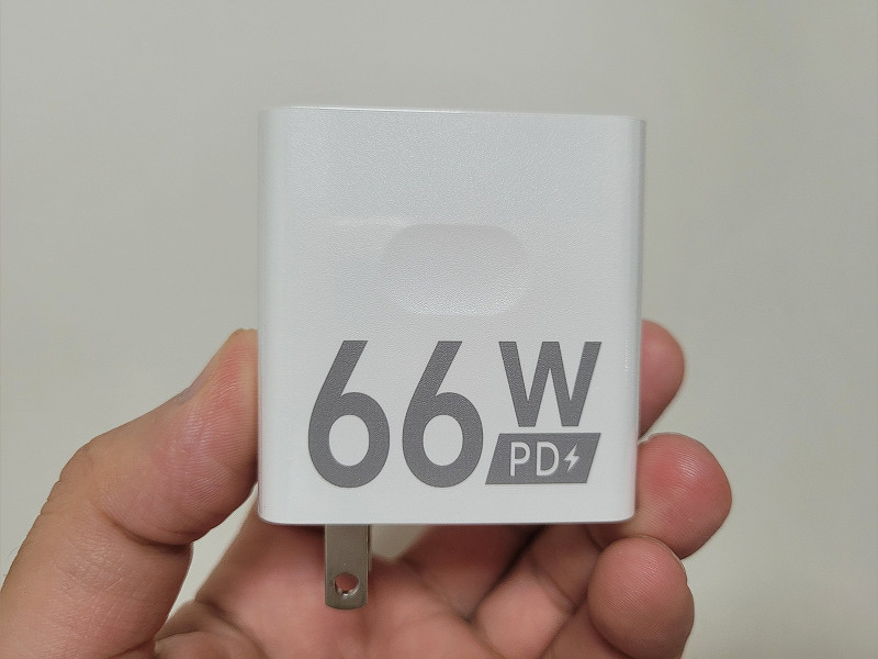 本体以外でひときわ目を引くのがUSB充電器で、Jelly Maxが対応しているUSB Power Deliveryの66W急速充電に対応した、同じくジャスト66W急速充電対応のものが付属されています。