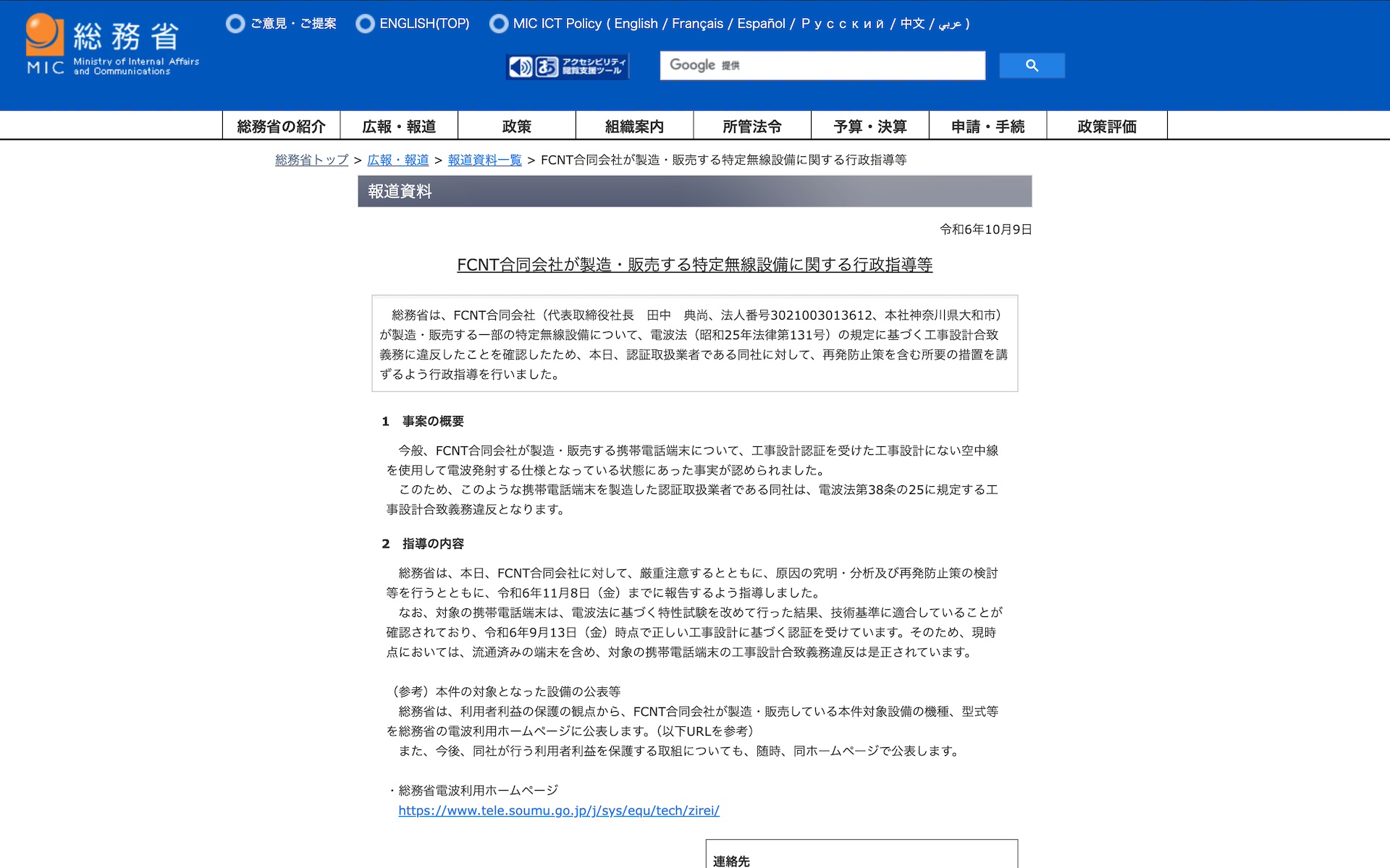 ・総務省|報道資料|FCNT合同会社が製造・販売する特定無線設備に関する行政指導等