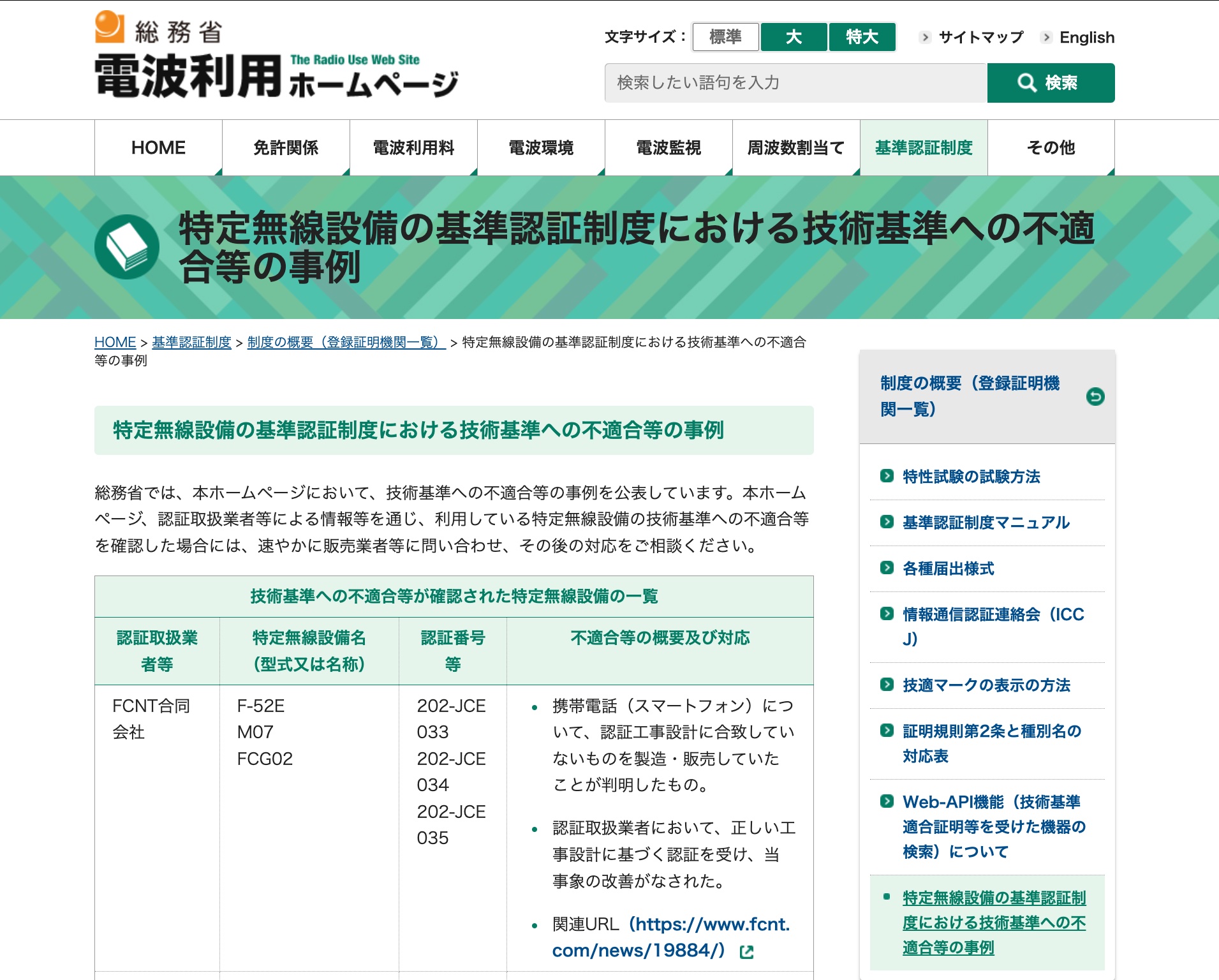 ・総務省 電波利用ホームページ|基準認証制度|特定無線設備の基準認証制度における技術基準への不適合等の事例