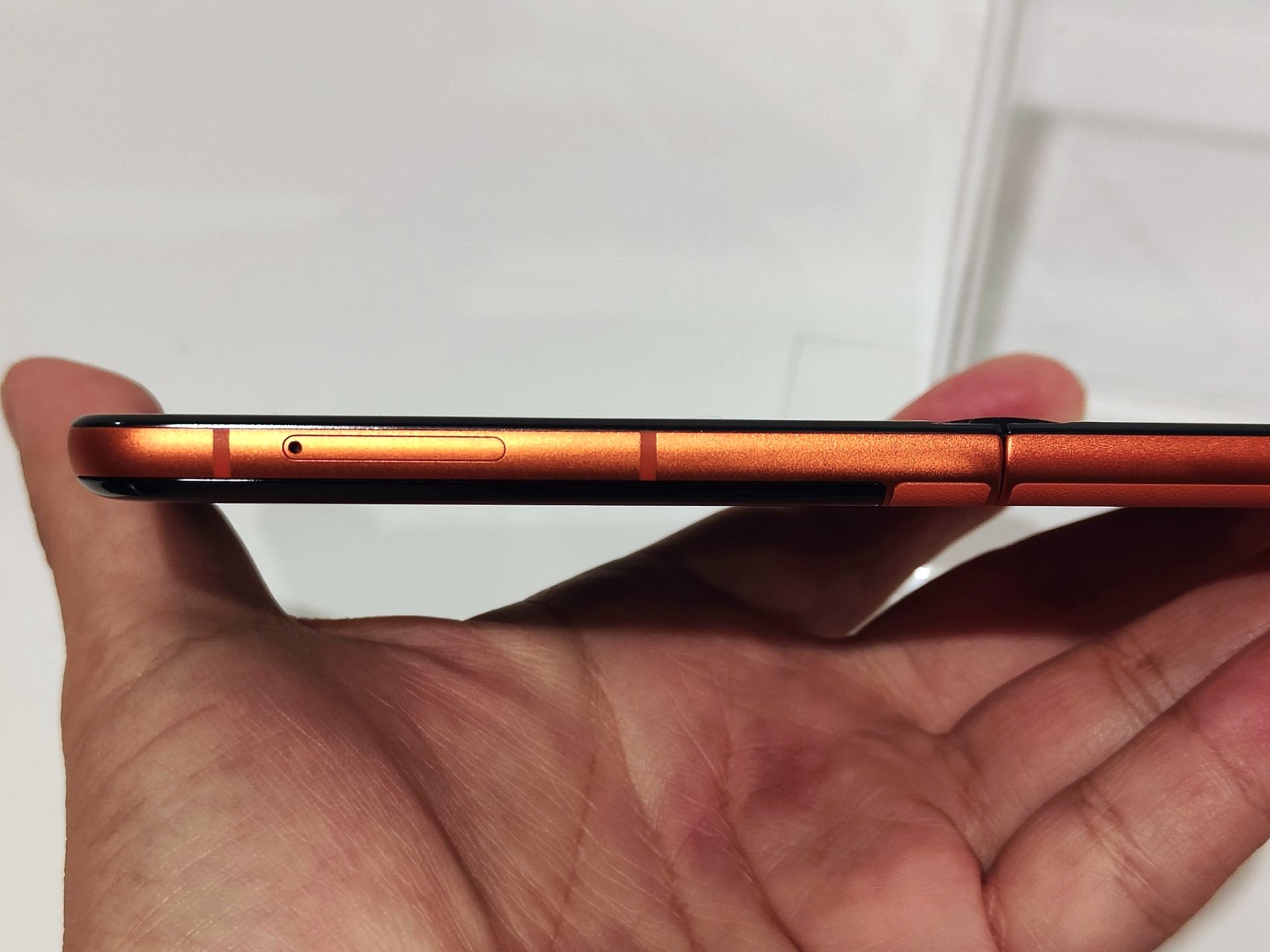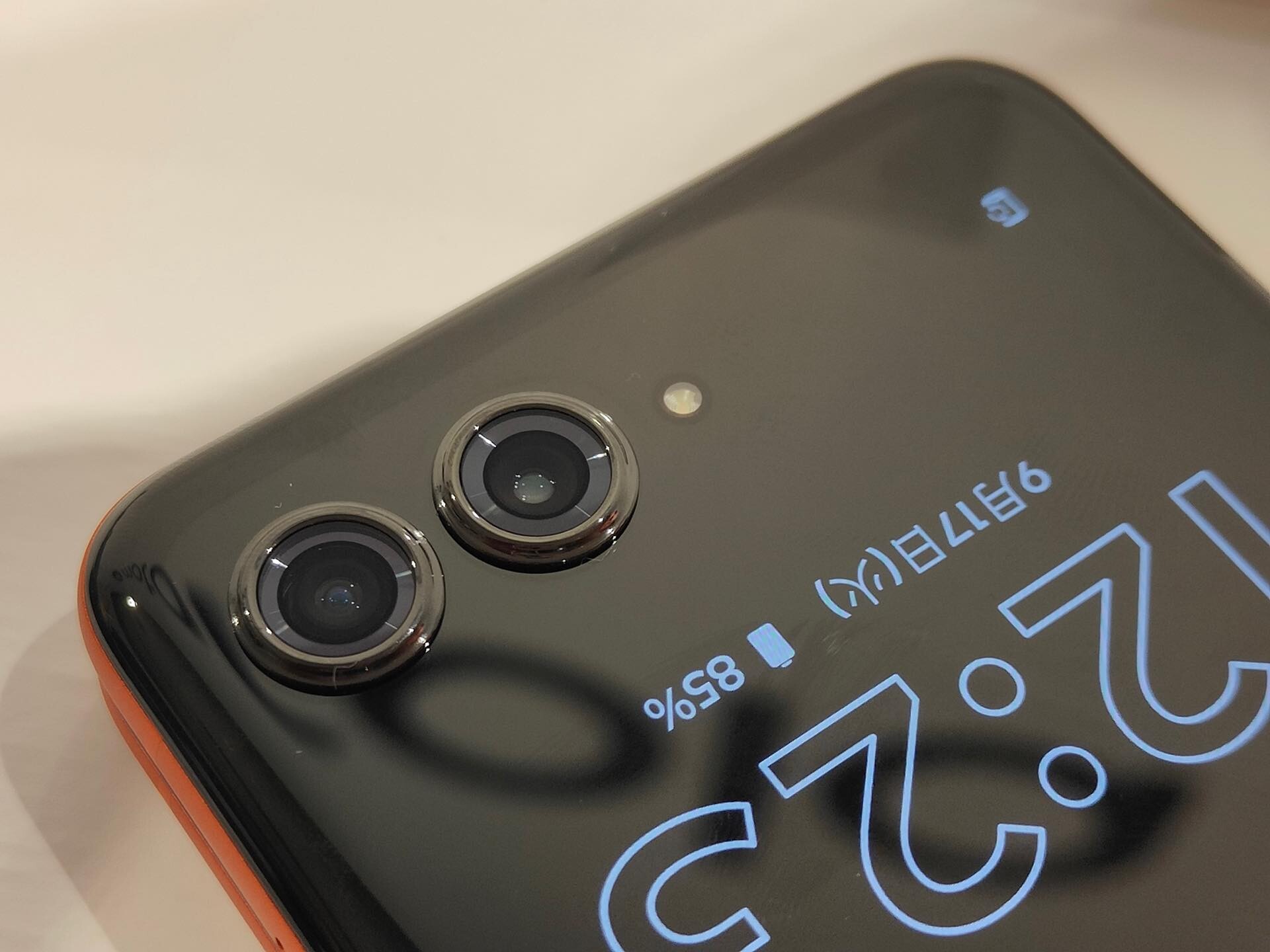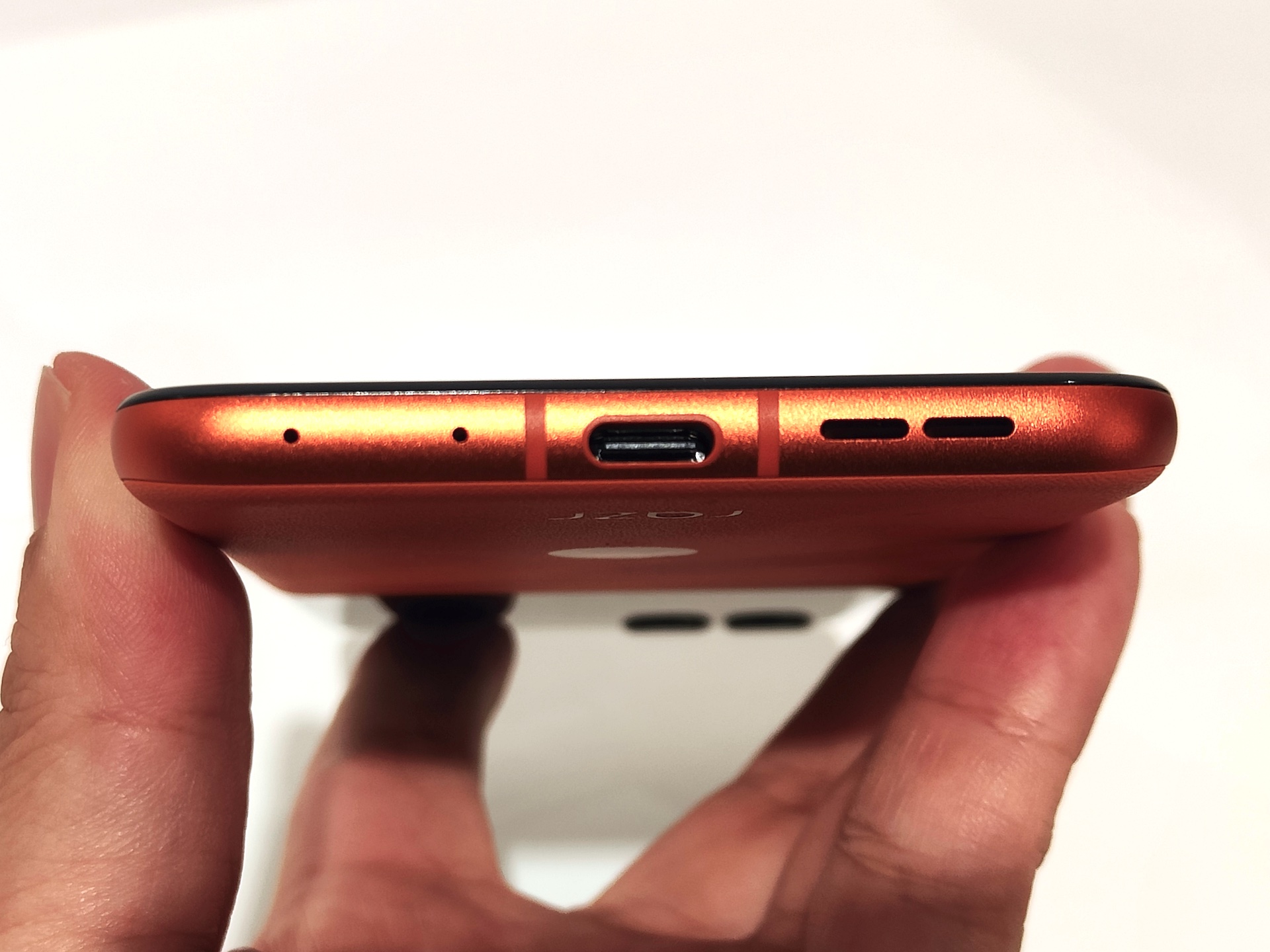 また開いた状態で使える内側にあるメインディスプレイは上部中央にパンチホールが配置されたアスペクト比9:22の縦長な約6.9インチFHD+(1080×2640ドット)pOLED(有機EL)ディスプレイ(約413ppi)を搭載し、10-bitカラーや最大90Hzリフレッシュレート、最大120Hzタッチサンプリングレート、明るさ最大1700nits、HDR10(Amazonビデオ対応)、100% DCI-P3などに対応しています。またパンチホール部分に約3200万画素CMOS(1画素0.7μm、4in1)+広角レンズ(F2.4)のフロントカメラ(インカメラ)が内蔵され、顔認証に対応しているほか、生体認証としては本体側面に指紋センサーが搭載されています。