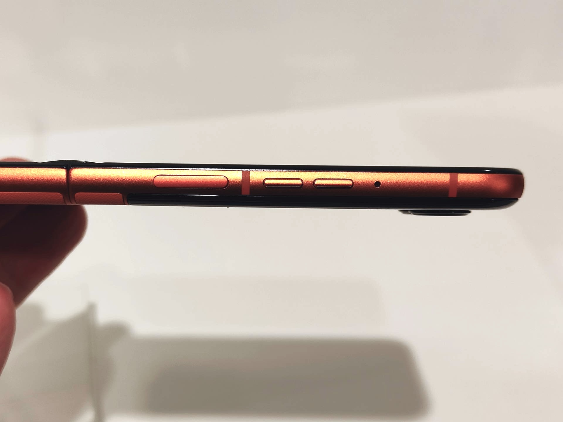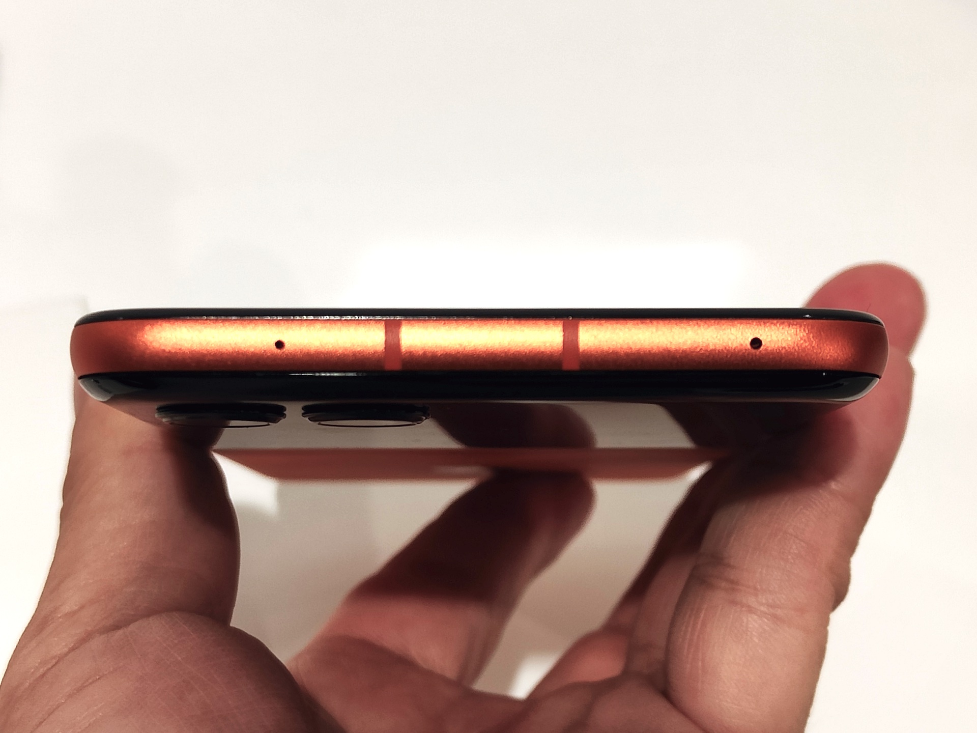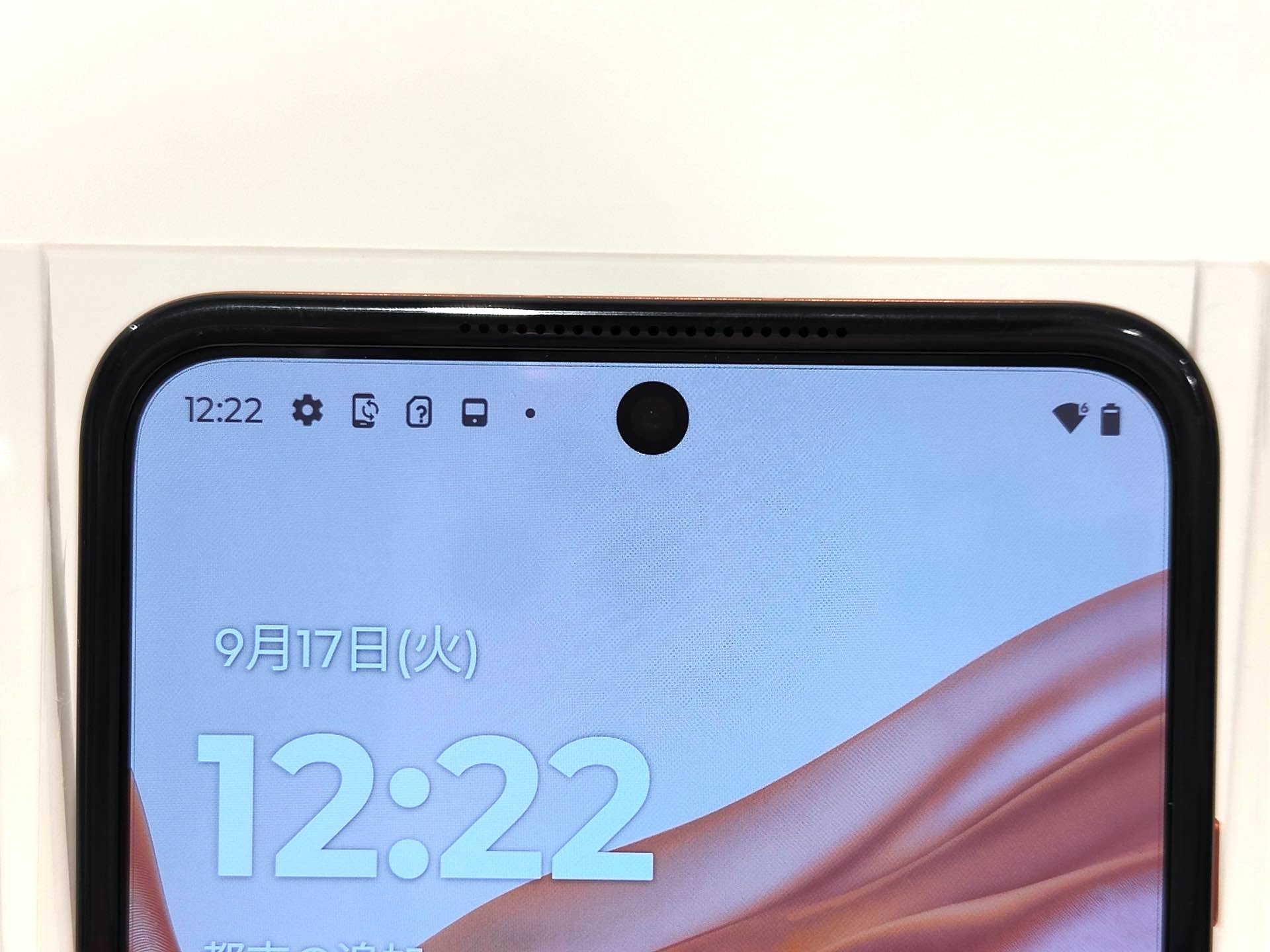 また開いた状態で使える内側にあるメインディスプレイは上部中央にパンチホールが配置されたアスペクト比9:22の縦長な約6.9インチFHD+(1080×2640ドット)pOLED(有機EL)ディスプレイ(約413ppi)を搭載し、10-bitカラーや最大90Hzリフレッシュレート、最大120Hzタッチサンプリングレート、明るさ最大1700nits、HDR10(Amazonビデオ対応)、100% DCI-P3などに対応しています。またパンチホール部分に約3200万画素CMOS(1画素0.7μm、4in1)+広角レンズ(F2.4)のフロントカメラ(インカメラ)が内蔵され、顔認証に対応しているほか、生体認証としては本体側面に指紋センサーが搭載されています。