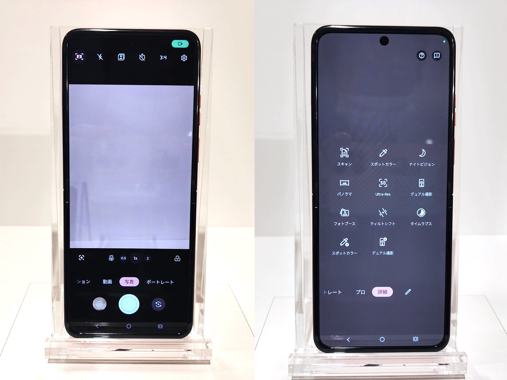 標準カメラアプリの撮影モードは標準モードにあたる「写真」の他に「スローモーション」や「動画」、「ポートレート」、「プロ」、「スキャン」が選択できる。もっとも右側にある「詳細」を選択すると、さらに他の撮影モードを選択することができる。また「スポットカラー」や「ナイトビジョン」、「パノラマ」、「Ultra-Res」(5000万画素撮影モード)、「デュアル撮影」、「フォトブース」「ティルトシフト」「長時間露光」「タイムラプス」が用意されています。