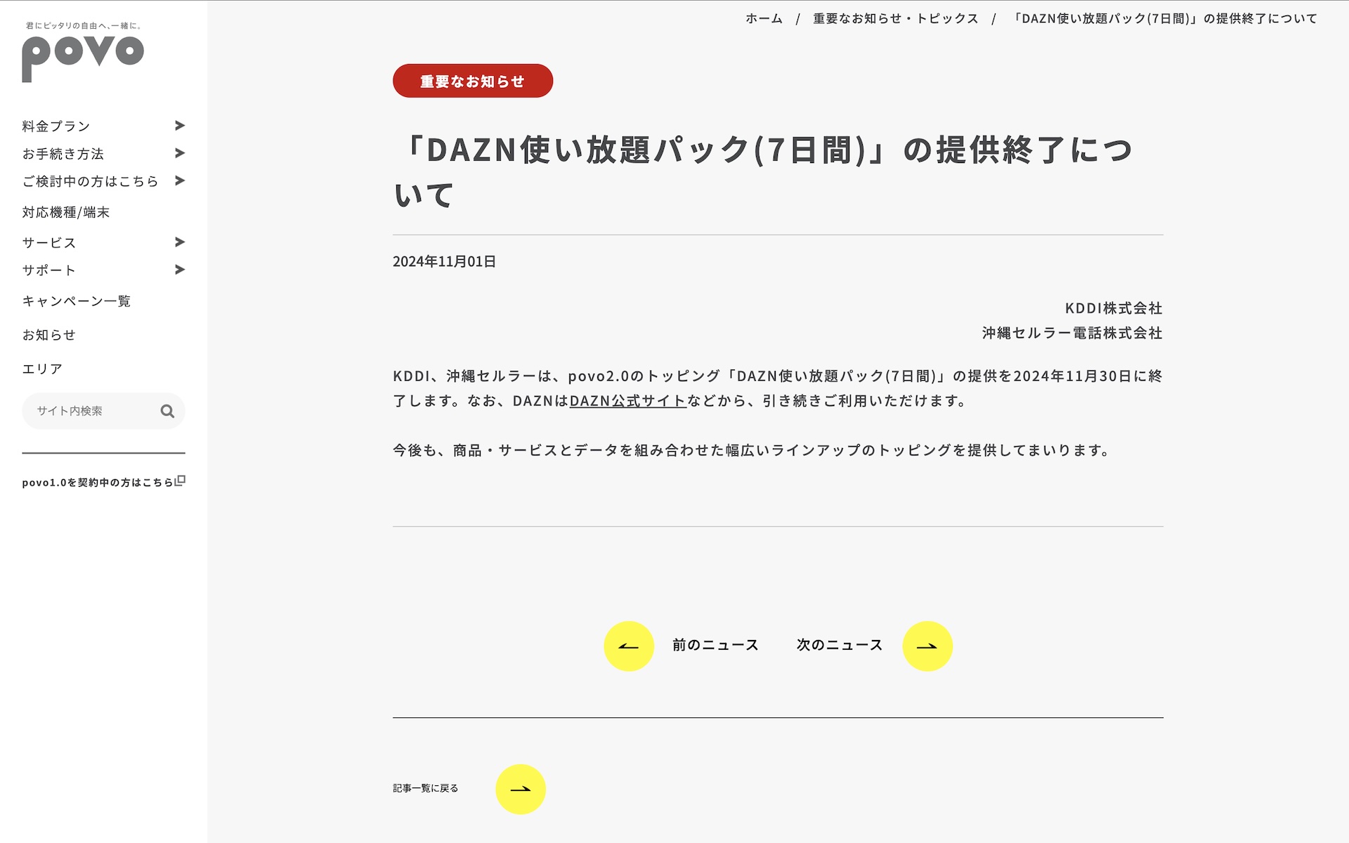 KDDIおよび沖縄セルラー電話は1日、オンライン専用の料金プランとして提供している携帯電話サービス「povo2.0」( https://povo.jp/ )において常に提供しているいつものトッピングのうちのコンテンツトッピング「DAZN使い放題パック(7日間)」の提供を2024年11月30日(土)に終了すると案内しています。