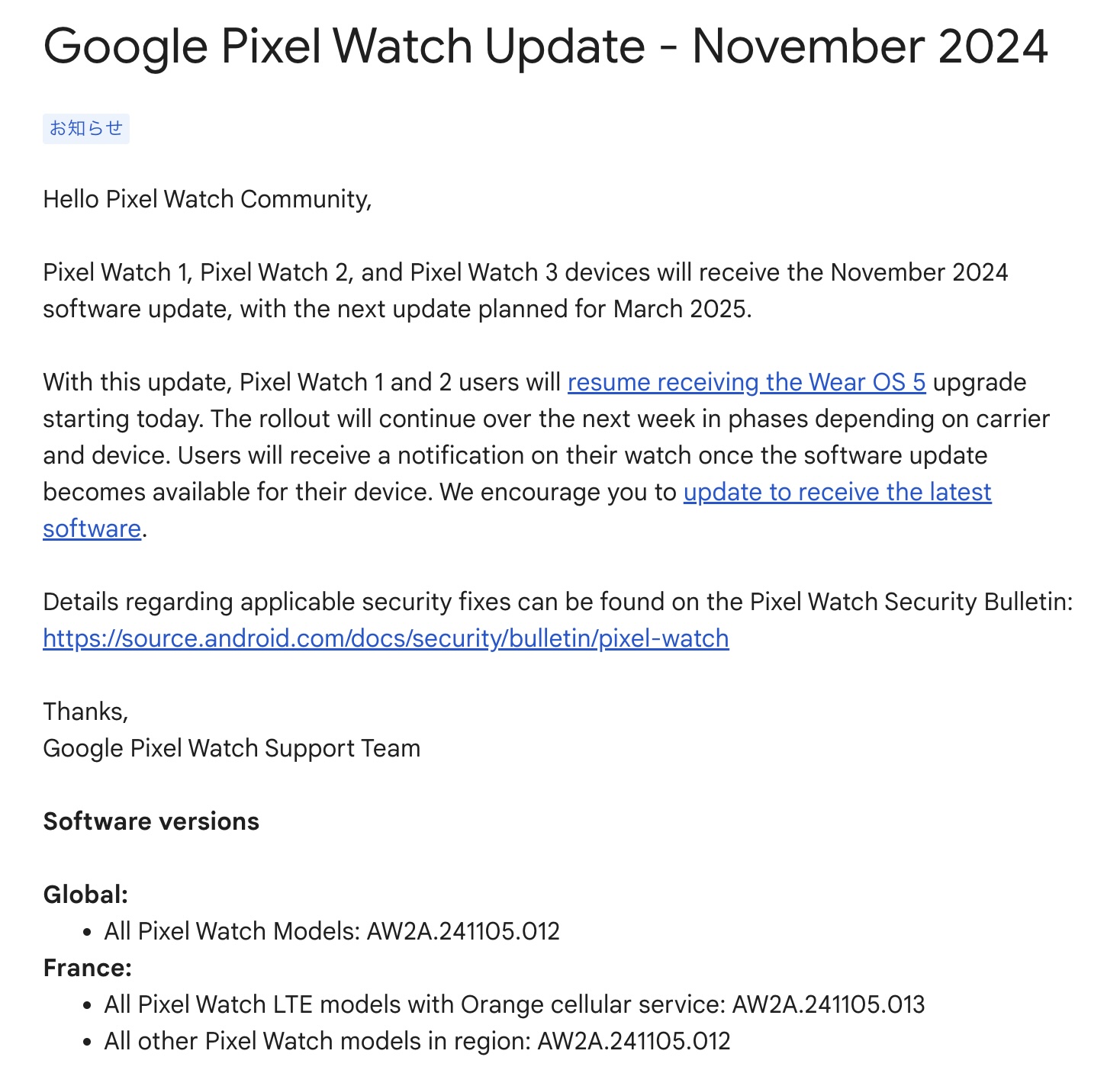 更新後のビルド番号はフランス向けのみブランチしており、フランスのOrangeの通信サービスを利用しているLTEモデルは「AW2A.241105.013」、フランスのそれ以外は「AW2A.241105.012」、フランス以外の日本向け製品を含めたグローバル向けではすべてで「AW2A.241105.012」となるとのことで、ソフトバンクでは更新の完了まで最大30分程度かかる場合があると案内しています。なお、GoogleではPixel Watchシリーズへの次回のソフトウェア更新が2025年3月になるとしています。