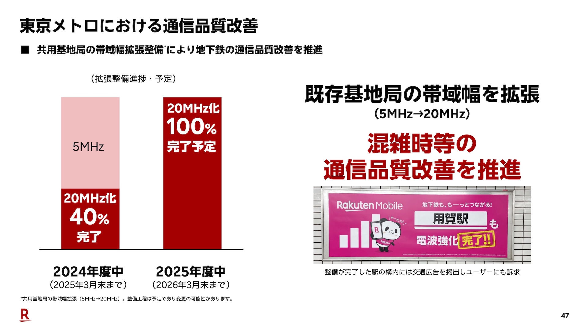 一方、同社では今年11月に実施された楽天グループの「2024年度第3四半期 決算説明会」において地下鉄の共用基地局にて利用する周波数帯域幅を5MHzから20MHzに拡張整備を実施して通信品質改善を推進していることを明らかにし、東京地下鉄が運行する地下鉄「東京メトロ」においては2024年度中(2025年3月末まで)に20MHz化を40%完了させ、さらに2025年度中(2026年3月末まで)に20MHz化を100%完了させる計画であることを示しました。
