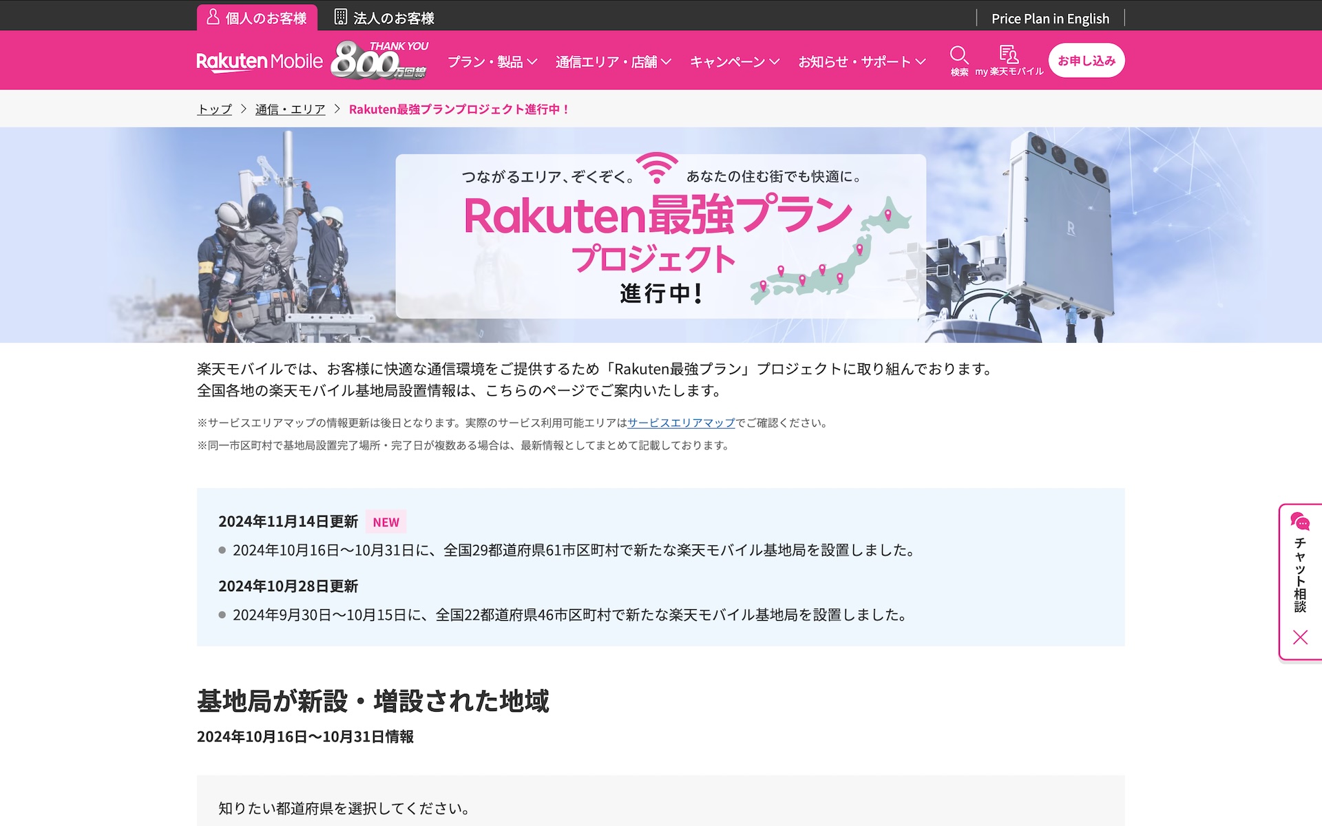 一方、昨年7月より新たに快適な通信環境を提供するために「Rakuten最強プラン」プロジェクトに取り組んでおり、全国各地の楽天モバイル基地局設置情報が市町村単位で公開されて確認可能で、一時は月1回の更新になったりもしていましたが、最近は再び月2回のペースに戻っており、今回は2024年10月16〜31日に全国29都道府県61市区町村で新たな基地局が設置されたとのことです。例えば、東京都でも各地で新たな基地局が設置されていることが示されています。