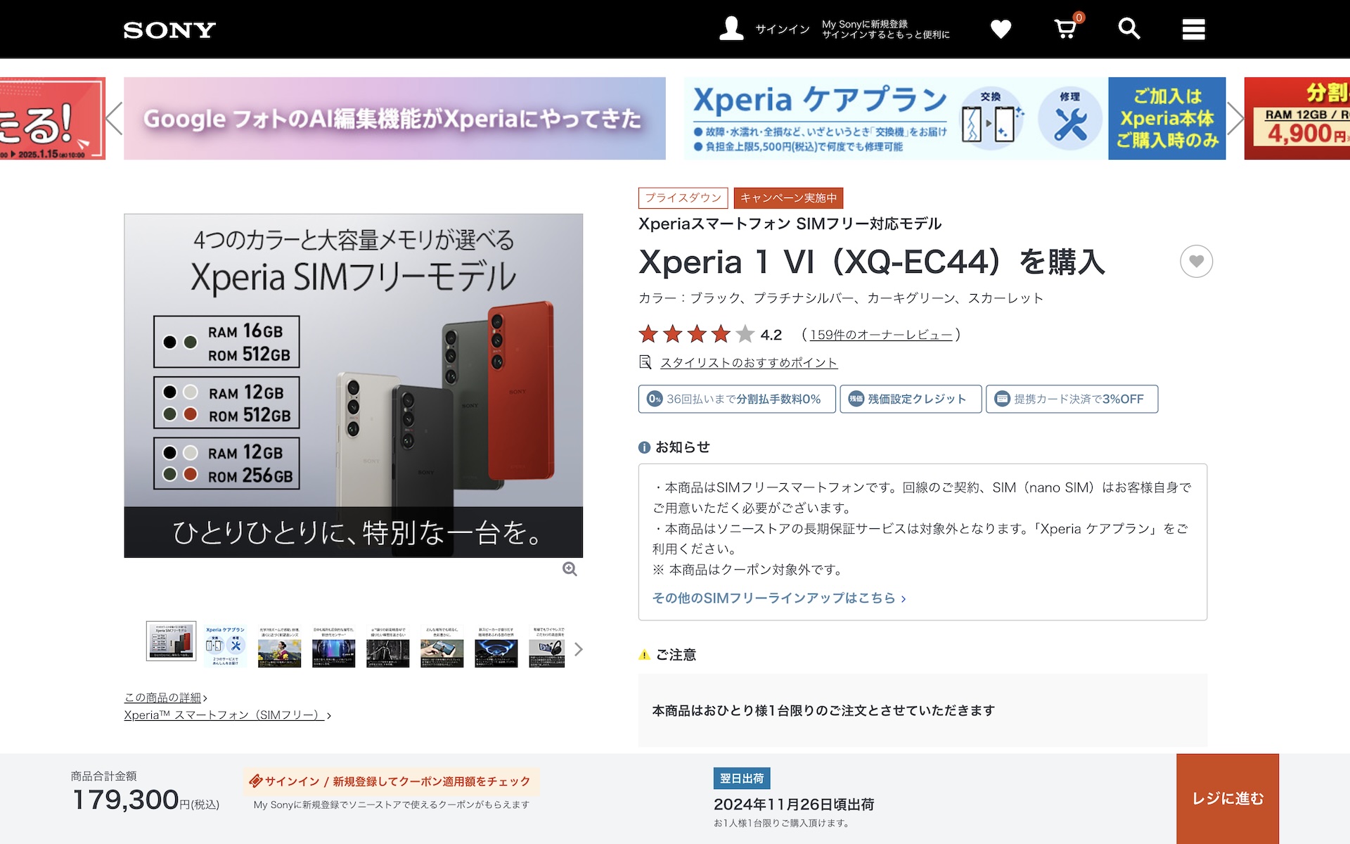 またソニーストア以外の量販店やECサイトなどでも値下げされており、例えば、ヨドバシ・ドット・コムやビックカメラ.comなどでも同様の価格でさらに1%(495ポイント)還元となっており、Xperia 1 VI XQ-EC44の12GB RAM+256GBストレージモデルが実質177,507円、12GB RAM+512GBストレージモデルが187,308円、Xperia 10 VI XQ-ES44が64,251円となっています。なお、Xperia 1 VI XQ-EC44およびXperia 10 VI XQ-ES44ともに日本市場向けとしておサイフケータイ(FeliCa)に対応しています。