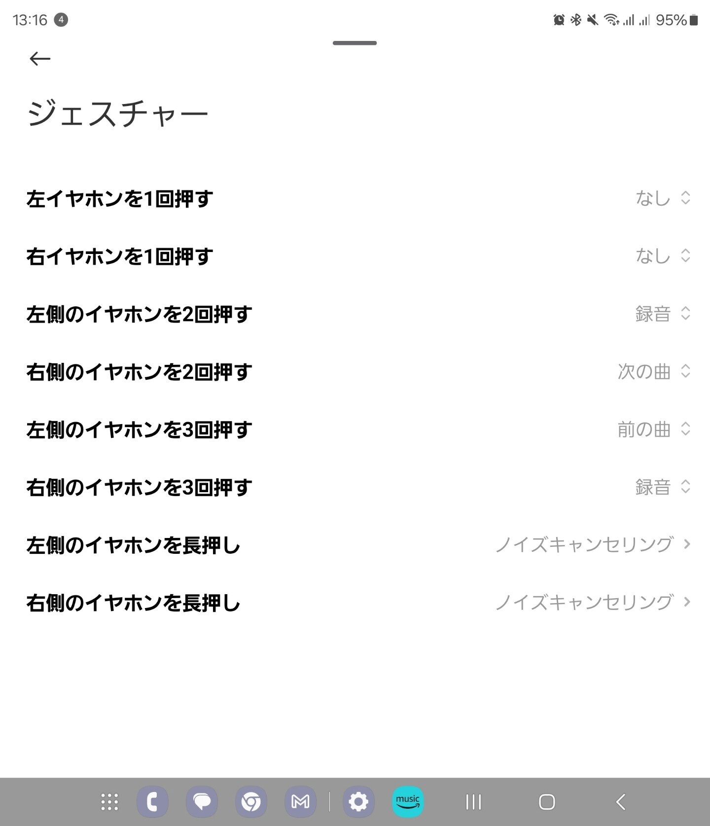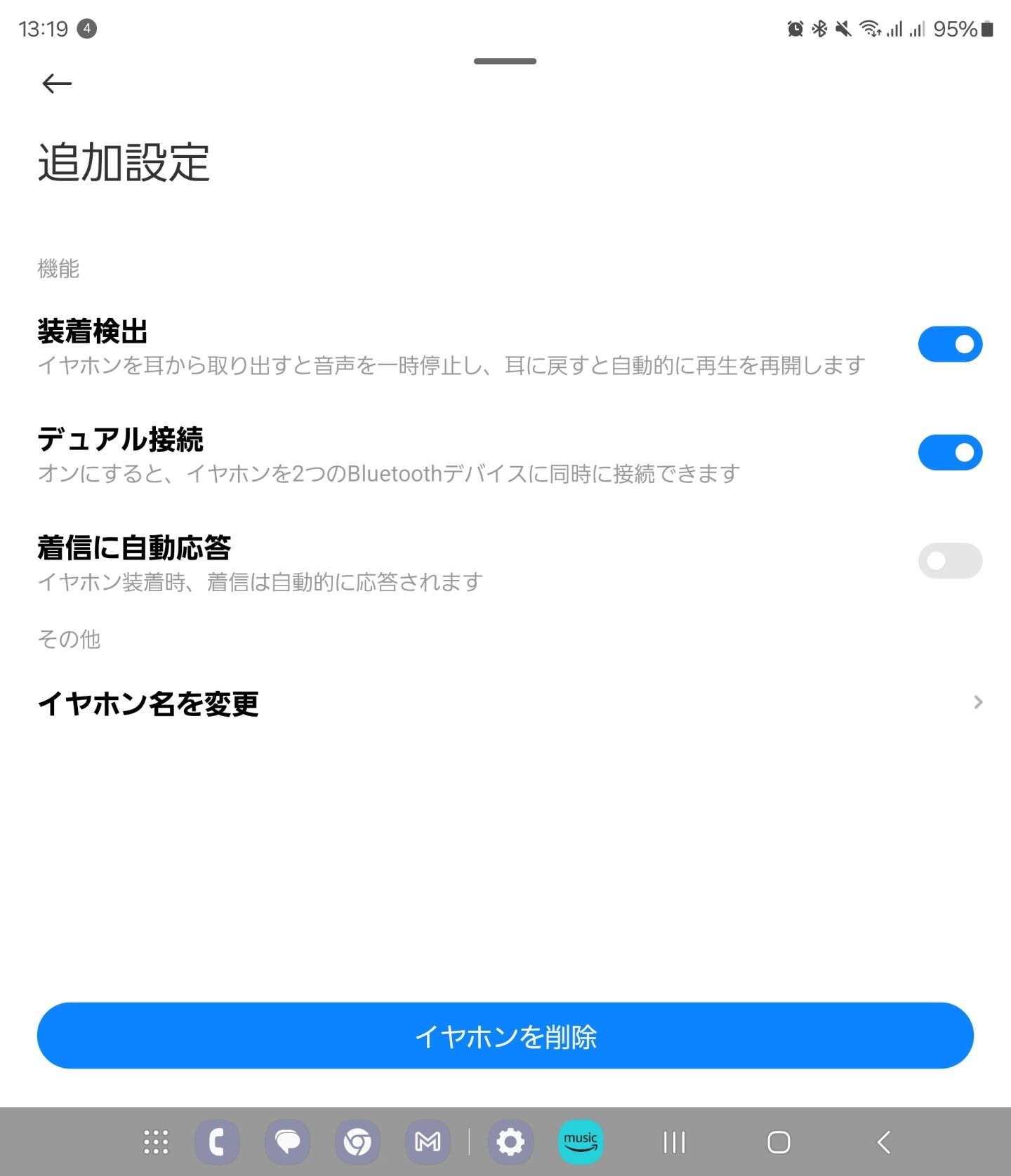 またオーディオ設定にてアダプティブサウンドをオンにすることで音楽の最適化がされます。その他にイヤホンのジェスチャーによる操作設定が可能です。さらに追加設定として装着検出、デュアル接続、着信に自動応答、イヤホン名を変更に対応しています。