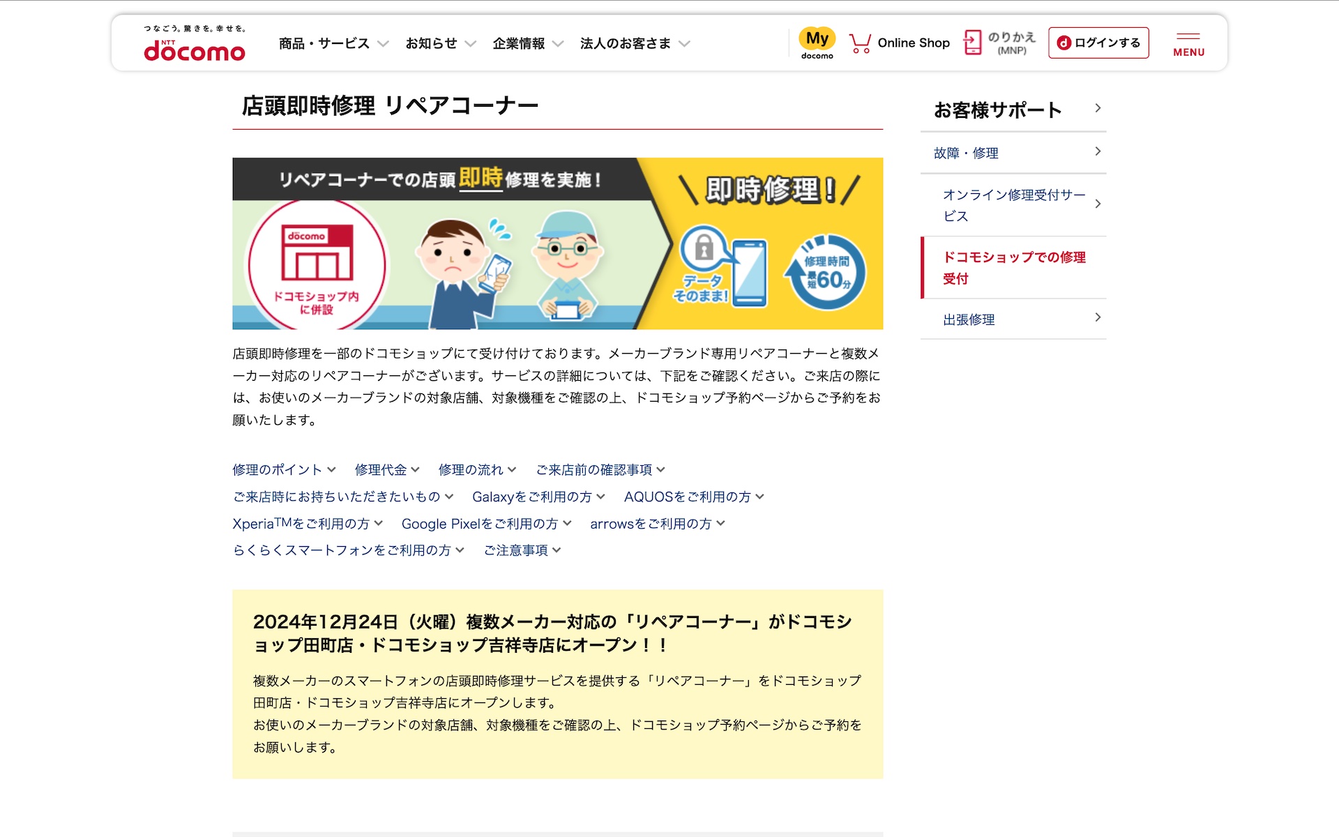 ・店頭即時修理 リペアコーナー | お客様サポート | NTTドコモ