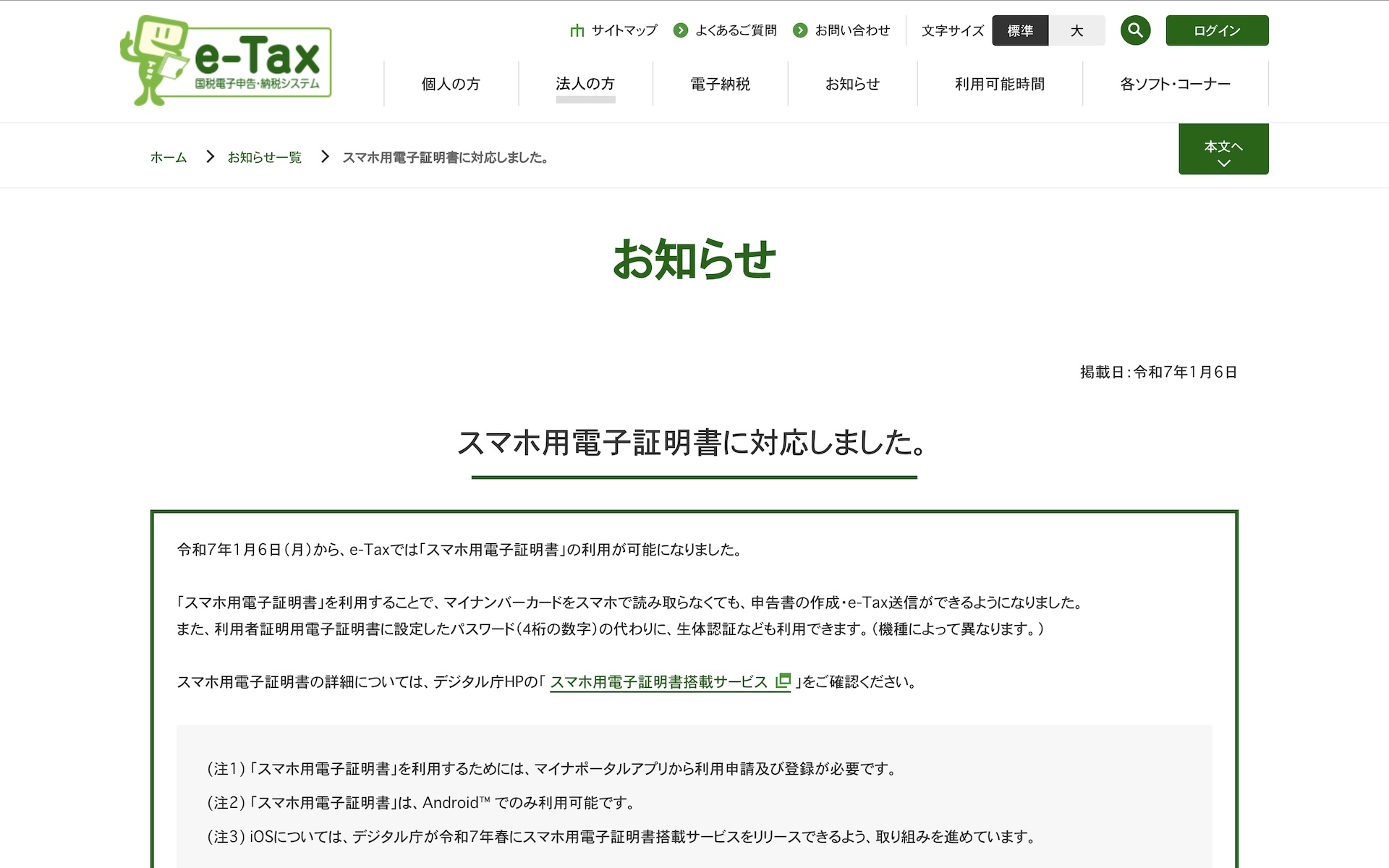 ・スマホ用電子証明書に対応しました。| 【e-Tax】国税電子申告・納税システム(イータックス)