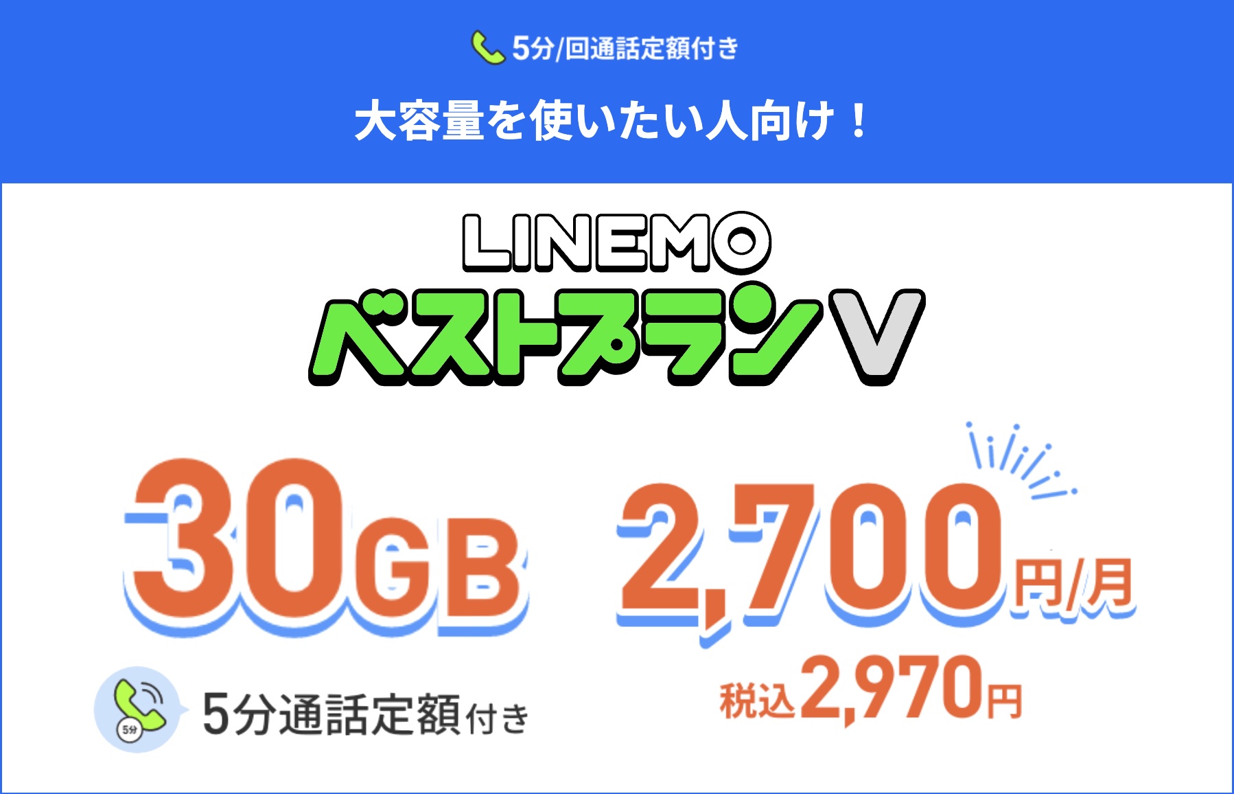 | LINEMOベストプランVが2月1日から月額2970円で通話5分無料+月間30GBに! |
