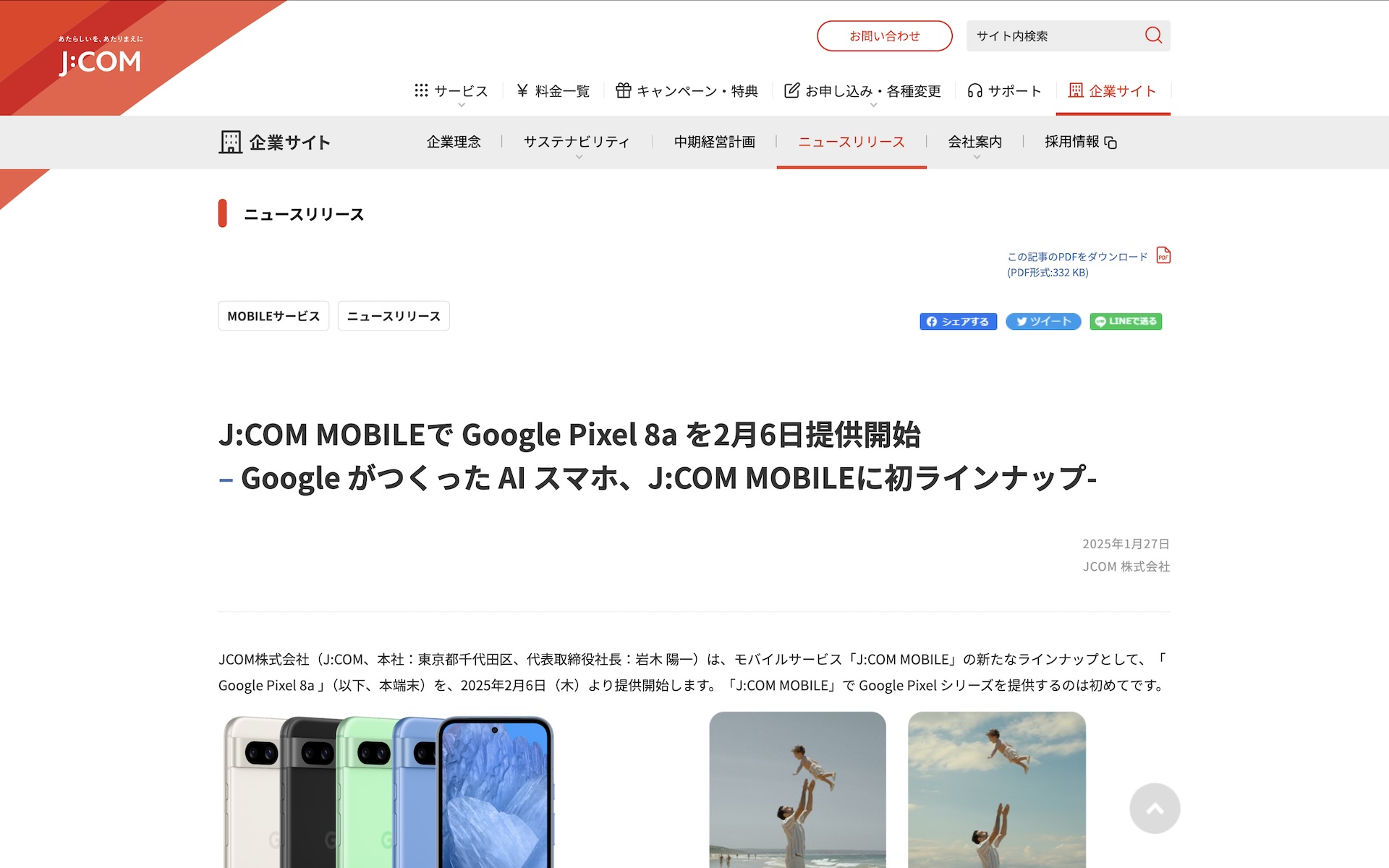 ・J:COM MOBILEで Google Pixel 8a を2月6日提供開始 – Google がつくった AI スマホ、J:COM MOBILEに初ラインナップ-|ニュースリリース | JCOM株式会社 | J:COM