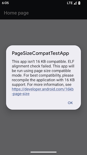 AndroidManifest.xmlでandroid:pageSizeCompatプロパティを設定して下位互換性モードを有効にすると、アプリの起動時にダイアログが表示されなくなります。最高のパフォーマンス、信頼性、安定性を得るにはアプリを16KBに揃える必要があります。詳細についてはアプリを更新して16KBのメモリページをサポートする方法に関する最近のブログ記事『Android Developers Blog: Get your apps ready for 16 KB page size devices』をお読みください。