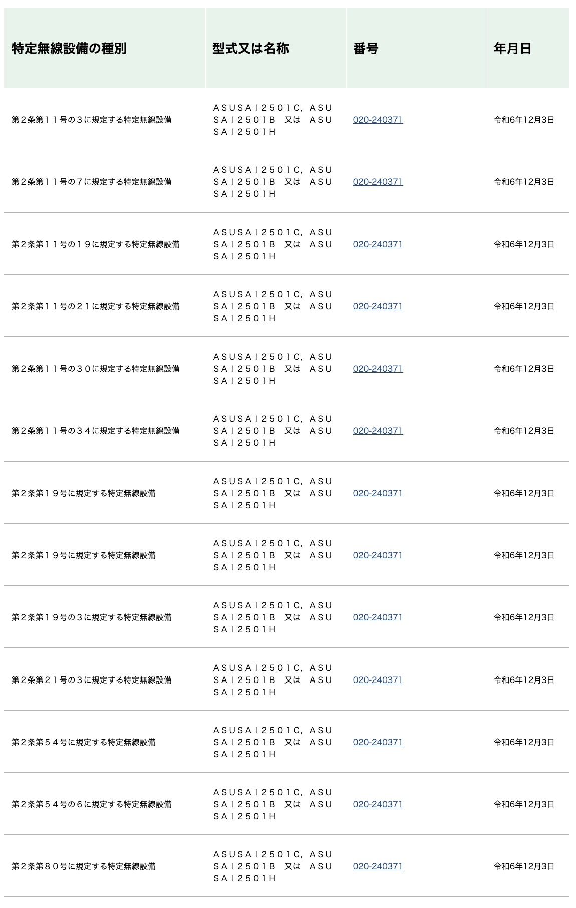総務省が「技術基準適合証明等を受けた機器の検索」のデータベースを更新し、新たにASUSTeK Computer(以下、ASUS)が「ASUSAI2501H」(認証番号:020-240371)の工事設計認証(いわゆる「技適」)を2024年12月3日(火)付けでTACによって取得しています。