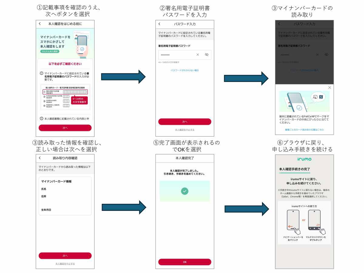 まずはマイナンバーカードを用いた公的個人認証サービス(以下、JPKI)による本人確認をahamoは2025年3月4日(火)9時(予定)から、irumoは2025年3月25日(火)9時(予定)から追加いたします。さらに今後2025年夏からICチップの読み取りに対応した「eKYC」(容貌画像+ICチップ情報)による本人確認を追加する予定です。なお、JPKIやeKYC(容貌画像+ICチップ情報)による本人確認はAndroidおよびiOSの非接触IC機能「NFC」の読み取り対応機種において利用可能です。