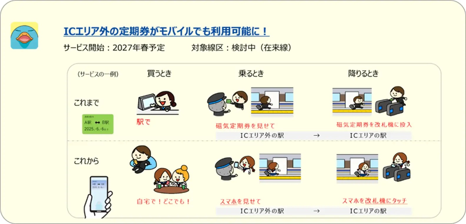 さらにこれまでICエリア外の駅を定期券区間に含む定期券は磁気定期券のみの取り扱いとしていましたが、今後は2027年春(予定)よりモバイルICOCAで利用できるようにするということです。これにより、モバイルICOCAで定期券を利用できる地域がさらに広がります。対象線区は検討中(在来線)。その他にもJR西日本ではモバイルICOCAのサービス拡充を計画しており、詳細は決まり次第お知らせするとしています。