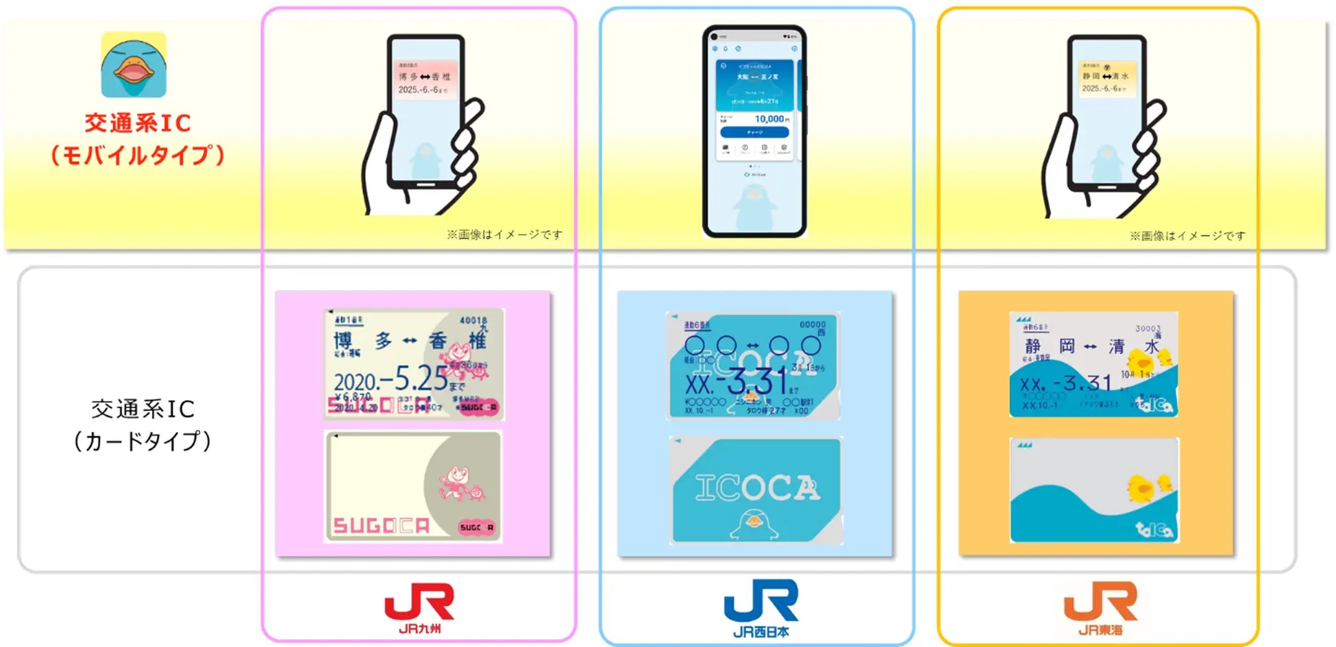 西日本旅客鉄道(以下、JR西日本)および東海旅客鉄道(以下、JR東海)、九州旅客鉄道(以下、JR九州)は7日、JR西日本のモバイルICサービス「モバイルICOCA」の仕組みを活用してJR東海の「TOICA」のモバイルICサービス「モバイルTOICA」を2026年春以降(予定)、JR九州の「SUGOCA」のモバイルICサービス「モバイルSUGOCA」を2027年春以降(予定)に開始すると発表しています。