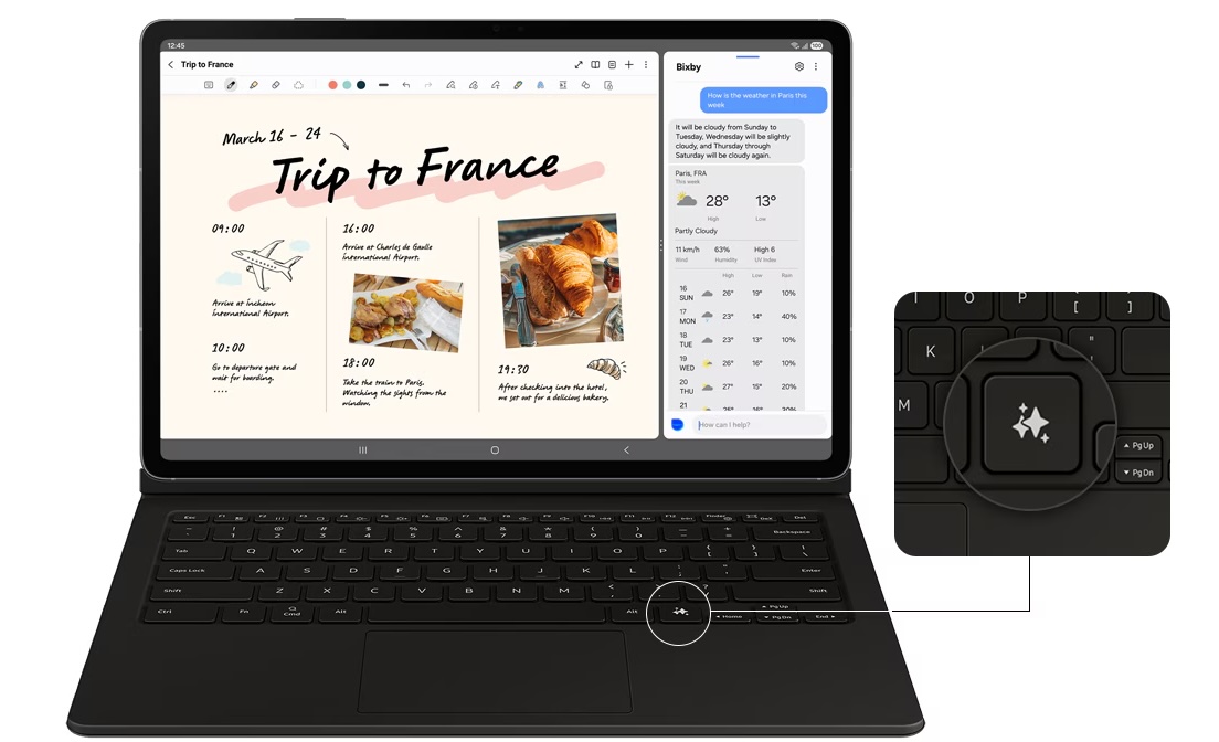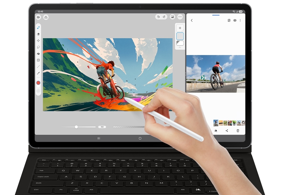 加えて「自動トリミング」機能は複数の動画からハイライトシーンを自動で抽出してシームレスに編集することによって思い出の瞬間を生き生きと再現してくれ、Book Cover Keyboardに搭載されたGalaxy AIキーをワンタップするだけでAIアシスタントが瞬時に起動し、好みに合わせてAIアシスタントをカスタマイズすることで、よりパーソナルな体験を実現します。他にも「LumaFusion」や「Goodnotes」、「Clip Studio Paint」などのプリインストールアプリやツール、さらに「Noteshelf」や「Sketchbook」、「Picsart」などの人気アプリも搭載し、創造力を解き放つためのキャンバスとして活用できます。