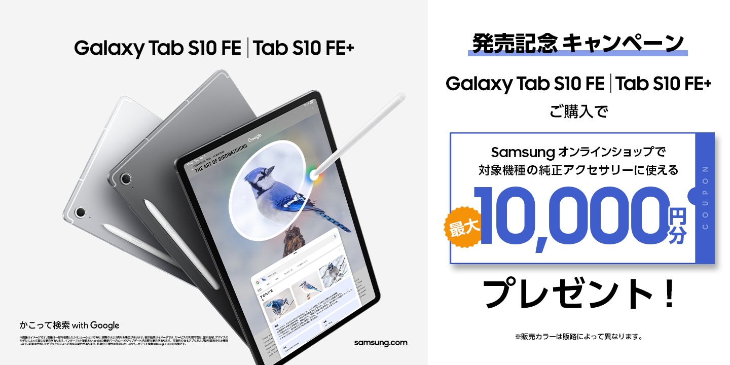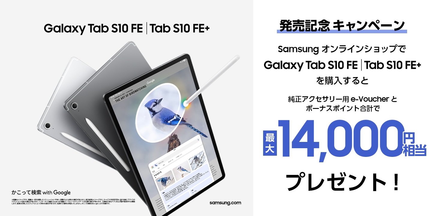 発売を記念して『「Samsung Galaxy Tab S10 FE|Tab S10 FE+」発売記念キャンペーン』( https://www.samsung.com/jp/offer/galaxy-tab-s10-fe-cp/ )が2025年5月9日(金)9:59まで実施され、Samsungオンラインショップの場合にはGalaxy Tab S10 FEおよびGalaxy Tab S10 FE+を購入すると、Samsungリワードポイントが通常獲得分にプラスして4%(最大4,360円相当)加算され、またこれらのタブレットと同時購入で対象機種の純正アクセサリーを購入すると、アクセサリーが値引きされる特典(e-Voucher)を進呈されます。