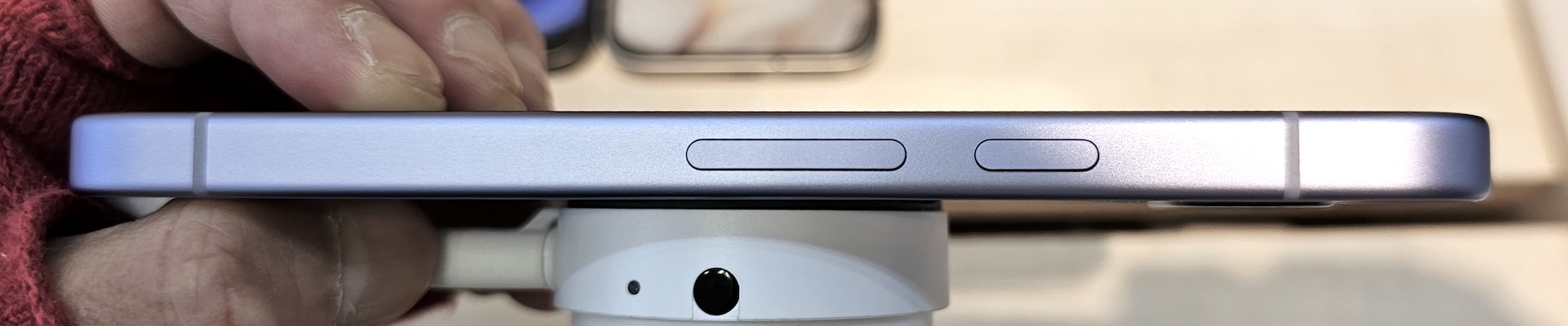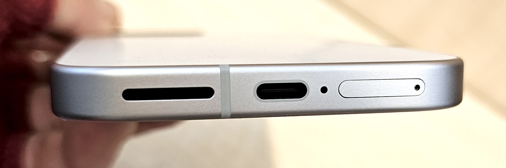 Pixel 9aのリアカメラの出っ張り具合。ほんの少しだけ出ているものの、ほぼフラットと言っても良いかな、という感じ。一方、個人的にはデザインは少し古くさく感じ、数世代前の低価格スマホという印象も受けました。ただし、そうした機種と比べると、質感自体は良いです