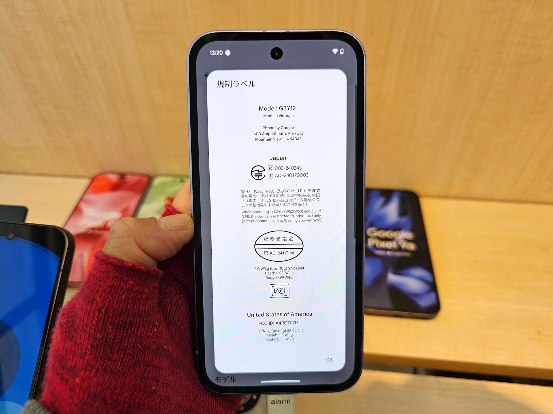 「規制ラベル」画面。日本向けモデルのG3Y12では日本向け認証(いわゆる「技適」)の番号は電波法に基づく工事設計認証(R)が「003-240243」と電気通信事業法に基づく技術基準適合認定(T)が「ADF240170003」に