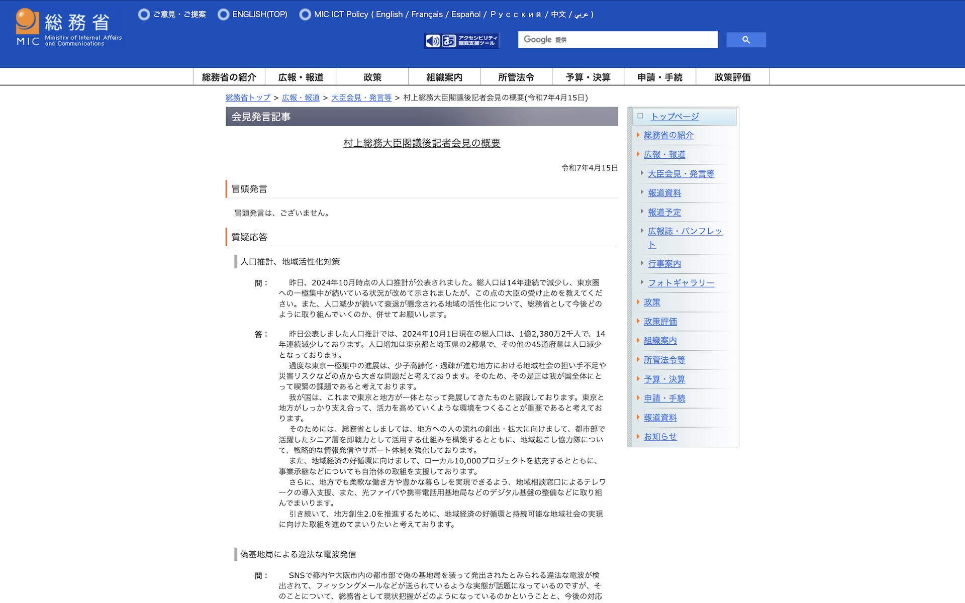 ・総務省|村上総務大臣閣議後記者会見の概要(令和7年4月15日)