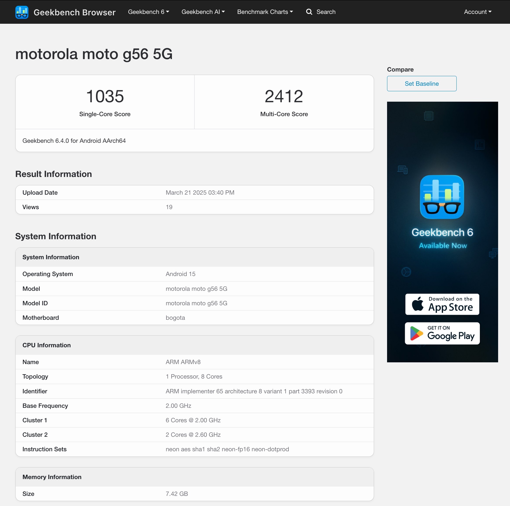 また資料にはこれらの同一機種として「XT2529-1」(FCC ID:IHDT56AV1)がベースモデルであることが記載されており、XT2529-1が「Bogota」、XT2529-3やXT2529-4が「Bogota Japan」とされています。さらにベンチマークアプリ「Geekbench」の測定結果に次期ミッドレンジスマホ「moto g56 5G」が掲載されており、このMoterboardが「bogota」であることからXT2529-3やXT2529-4はmoto g56 5Gの日本向けモデルになると予想されます。