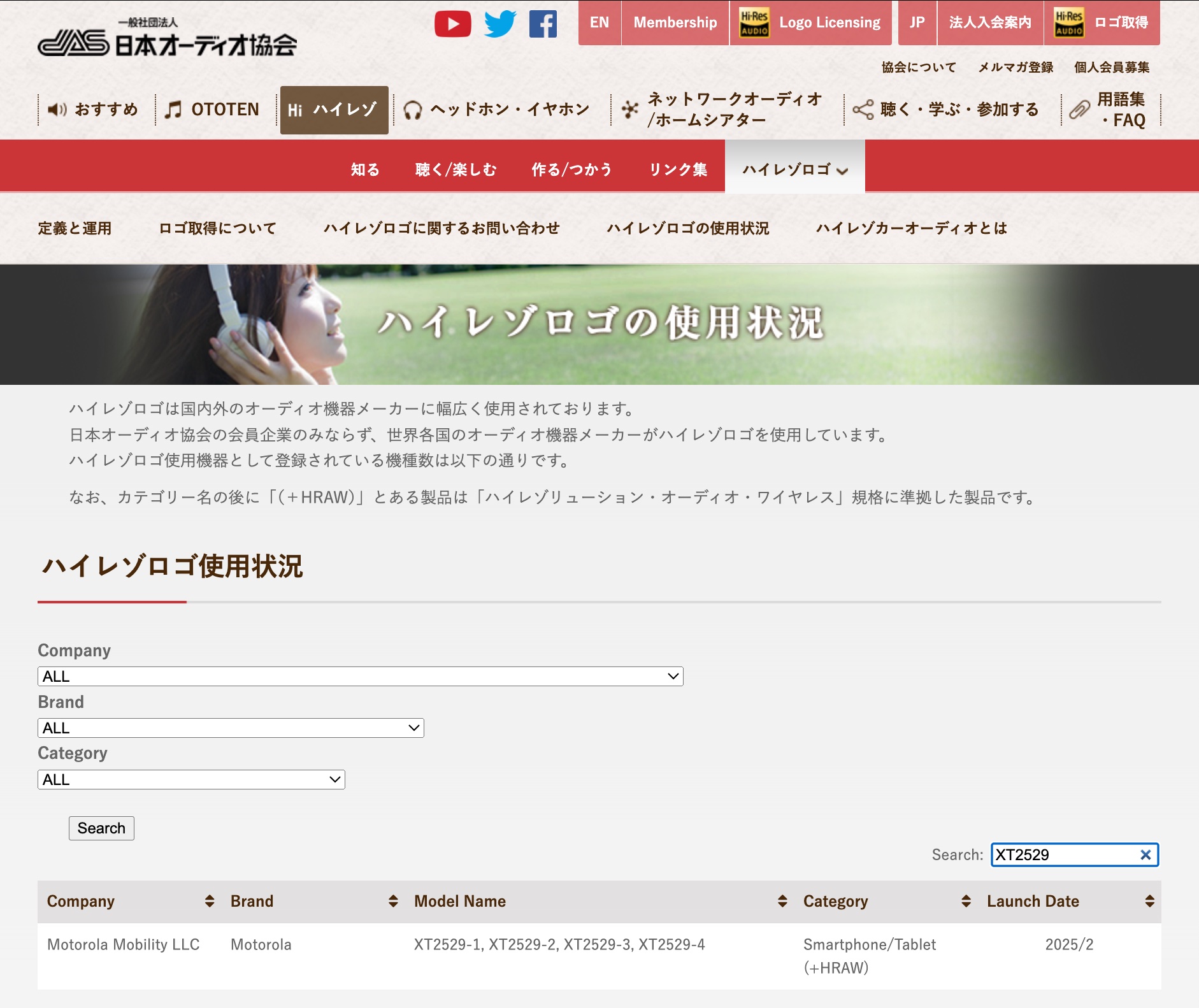 その他、FCCの資料から電池パックは「RB52」だとされており、TÜV Rheinland JapanなどにてCB認証を取得し、5100mAh(3.91V)であることが記載されているほか、日本オーディオ協会(JAS)における「ハイレゾロゴの使用状況」にXT2529-1および「XT2529-2」、XT2529-3、XT2529-4が登録されているため、ハイレゾ音源にも対応していることが示されています。