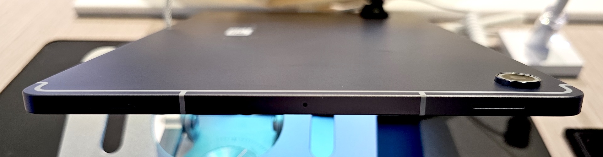 Galaxy Tab S10 FE+のグレーの背面。背面や側面はアルミニウム(金属)素材なので、アンテナラインがかなりしっかりと配置されています。またリアカメラの横にSペンを磁石でくっつけられるエリア「Sペンホルダー」が配置されています