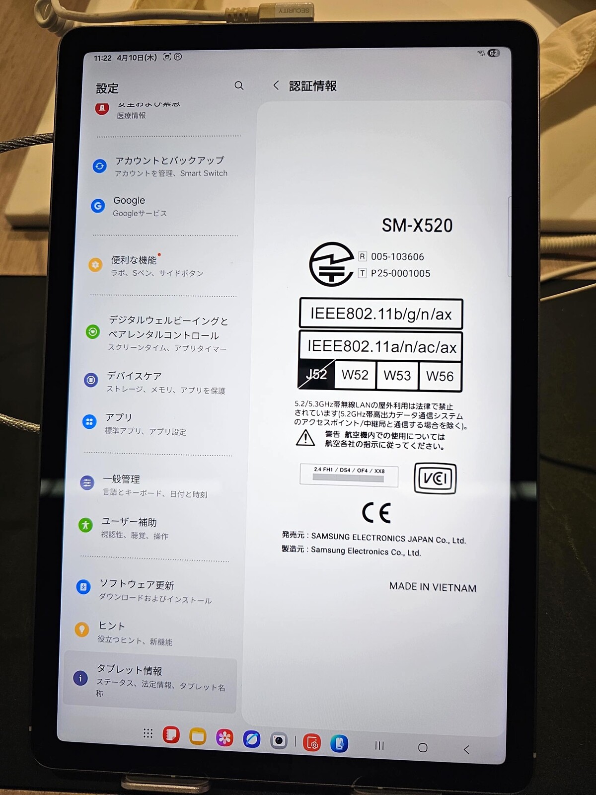 Galaxy Tab S10 FE+の認証情報。日本向けの認証番号は電波法に基づく工事設計認証(R)が「005-103607」、電気通信事業法に基づく技術基準適合認定(T)が「P25-0002005」。なお、ベトナム製