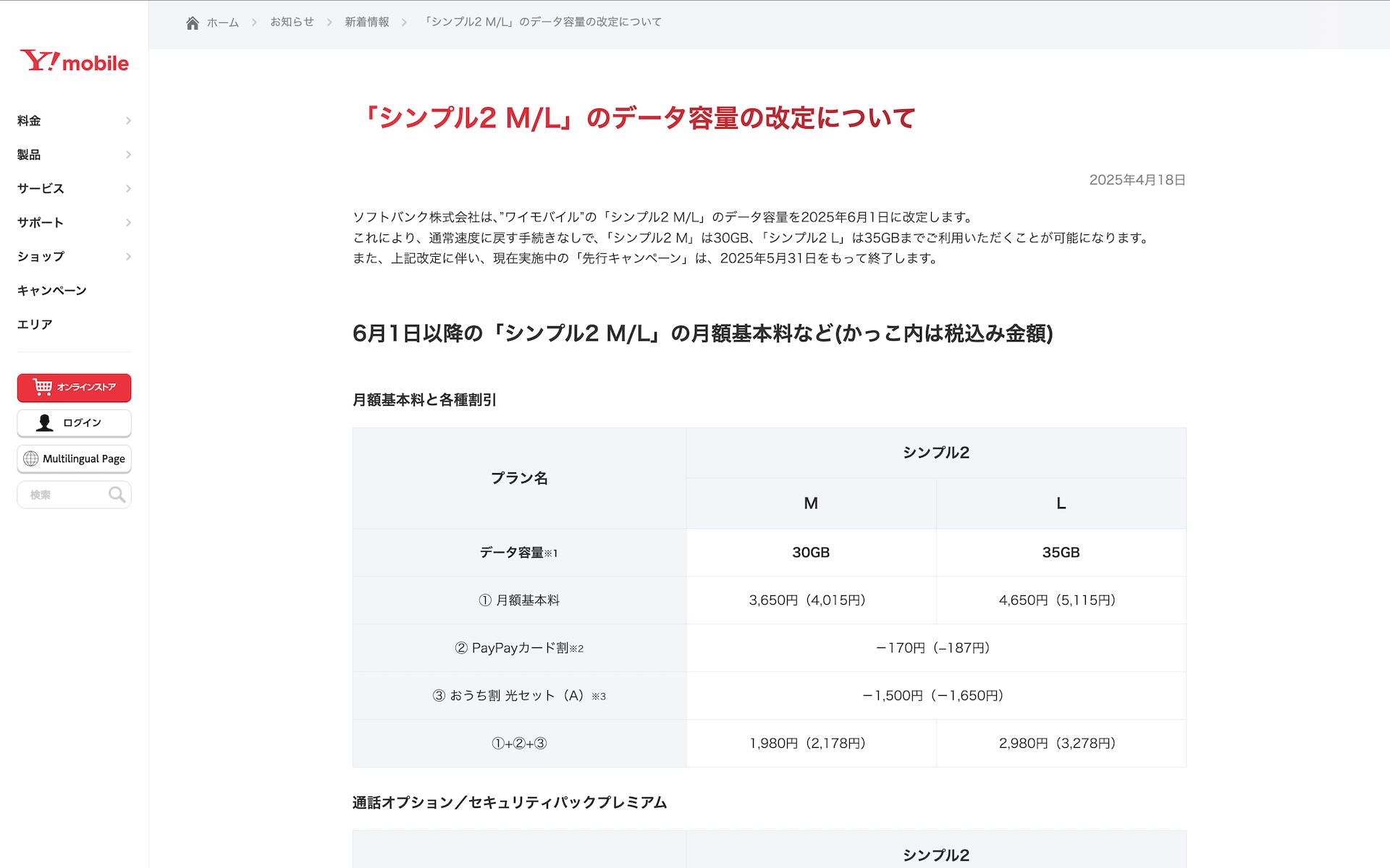 ・「シンプル2 M/L」のデータ容量の改定について / 2025/4/18|新着情報|お知らせ|Y!mobile - 格安SIM・スマホはワイモバイルで