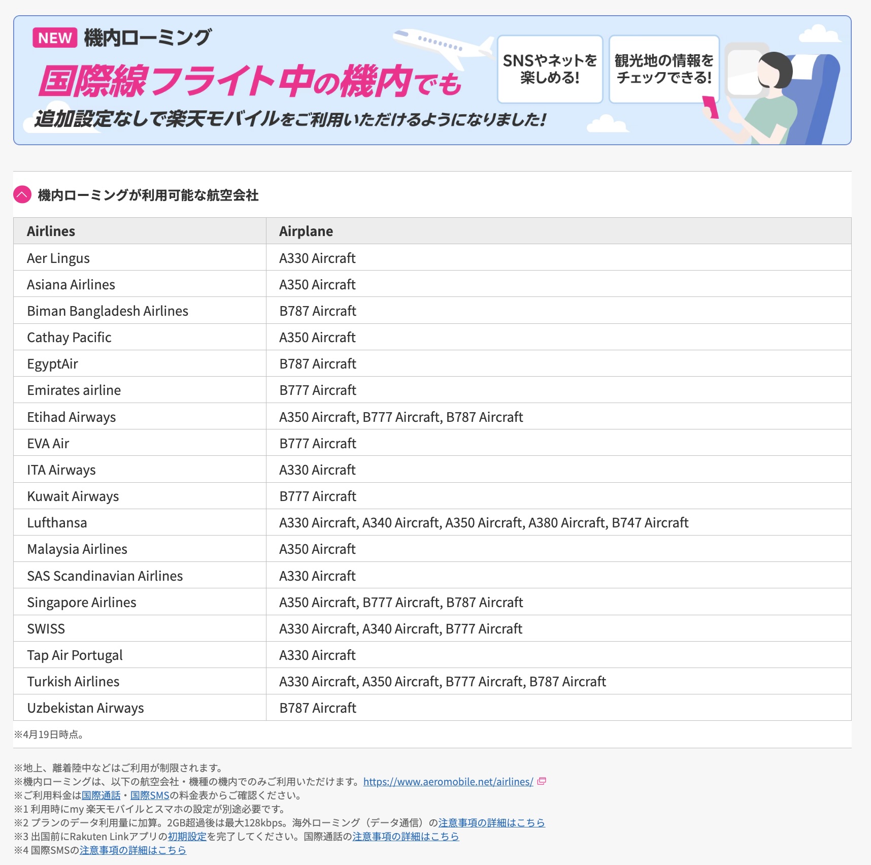 なお、機内ローミングはイギリスの通信会社「AeroMobile」との提携によって提供しており、詳細な対応する航空会社と機体は https://www.aeromobile.net/airlines/ を参照するように案内されています。またAeroMobileでは3G(W-CDMA方式)および2G(GSM方式)を用いており、楽天モバイルの機内ローミングでは月2GBを超えた場合には最大128Kbpsに速度制限されます。