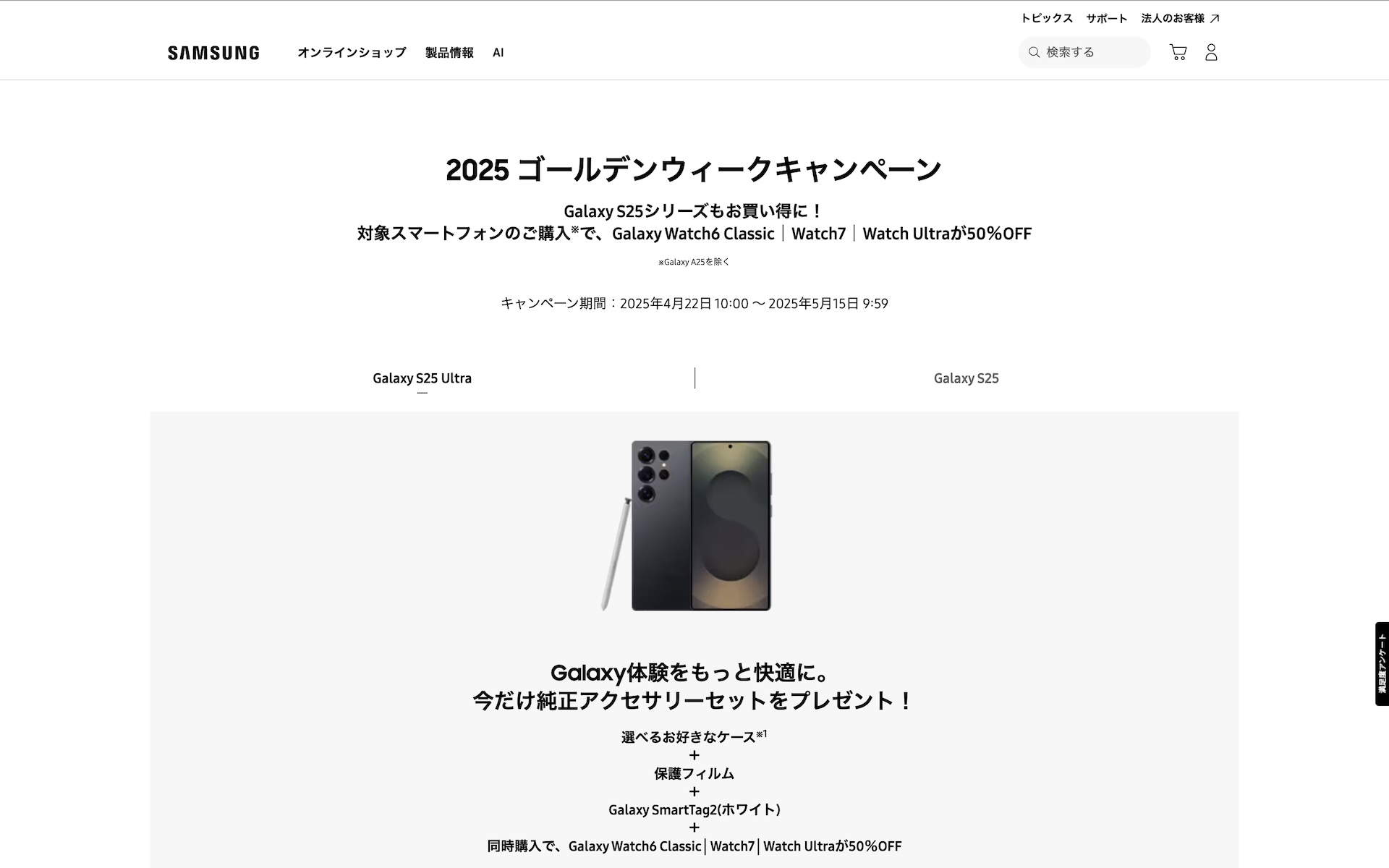 | Samsungオンラインショップ 2025 ゴールデンウィークキャンペーンが開催中! |