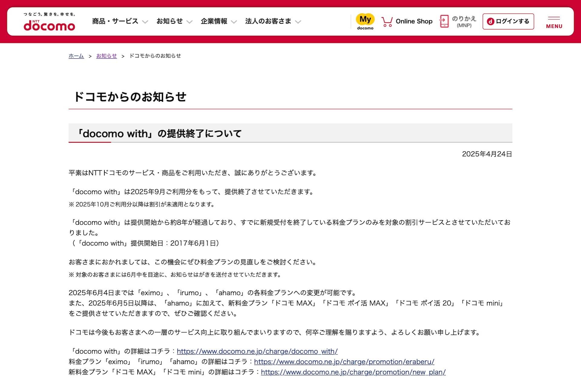 ・ドコモからのお知らせ :「docomo with」の提供終了について | お知らせ | NTTドコモ