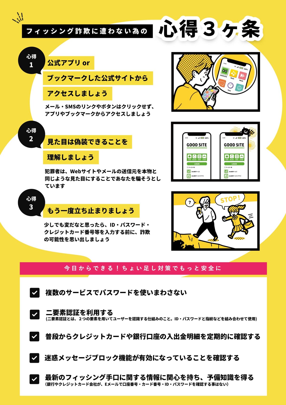 同省ではこの偽基地局からのSMSにて実在するWebページを装って利用者を誘導するフィッシング詐欺が行われているため、怪しいリンクをクリックしたり、IDやパスワード、個人情報などを入力したりしないようにくれぐれも注意するようにと喚起しています。なお、フィッシング詐欺はその手口がますます巧妙化しているとし、フィッシング詐欺に気が付いた時には利用するサービス事業者や警察などに相談するように案内しています。