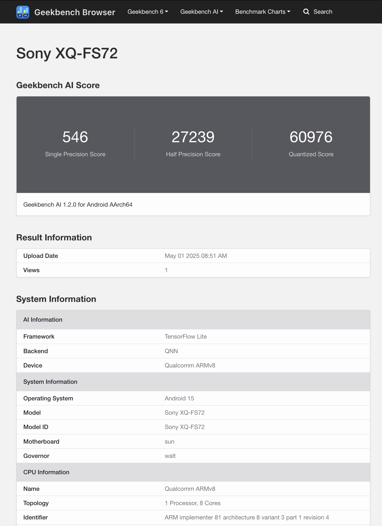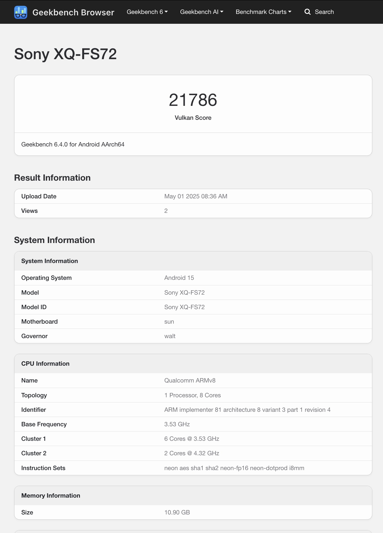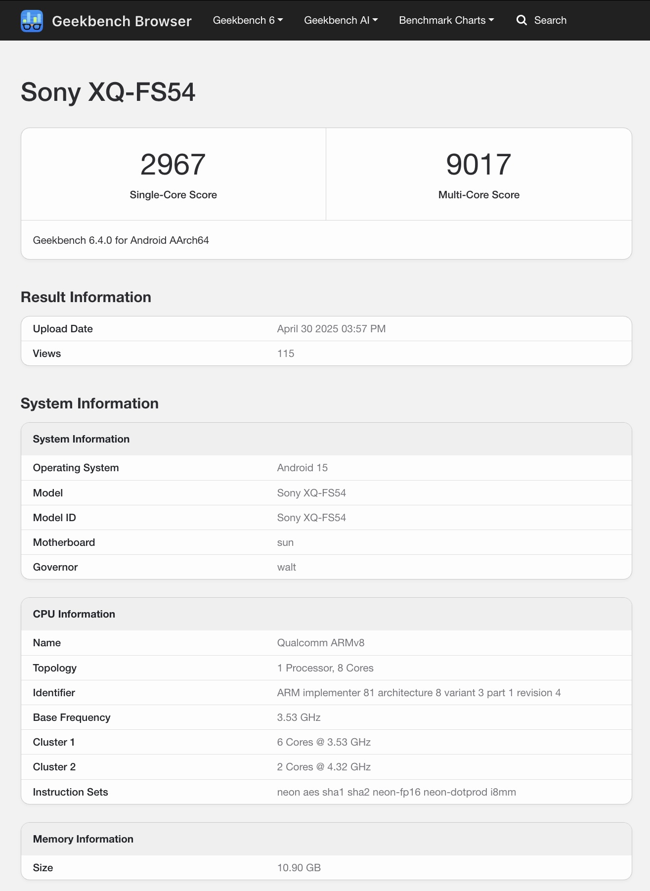 一方、新たにベンチマークアプリ「Geekbench」における測定結果にこの台湾や中国向けのXQ-FS72やアメリカやカナダ向け「XQ-FS54」が登場しており、スコアはCPUのシングルコアで2967、マルチコアで9017、GPUのVulkanで21786、AIのシングルプレシジョンで546、ハーフプレシジョンで27239、クオンタイズドで60976となっており、Motherboardは「sun」であるため、チップセット(SoC)にはQualcomm製「Snapdragon 8 Elite Mobile Platform」になることが明らかになっています。