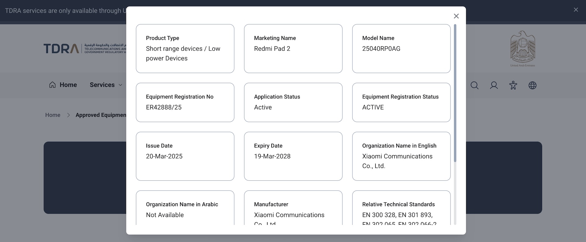 25040RP0AGは現時点で海外でも未発表な製品なので詳細は不明ですが、アラブ首長国連邦(UAE)の電気通信・デジタル政府規制局(TDRA)でも認証(機器登録番号:ER42888/25)を2025年3月20日(木)付で取得しており、製品名が「Redmi Pad 2」とされているため、Xiaomiが展開するコストパフォーマンスを重視した「Redmi」ブランドの次期Androidタブレットとなるようです。