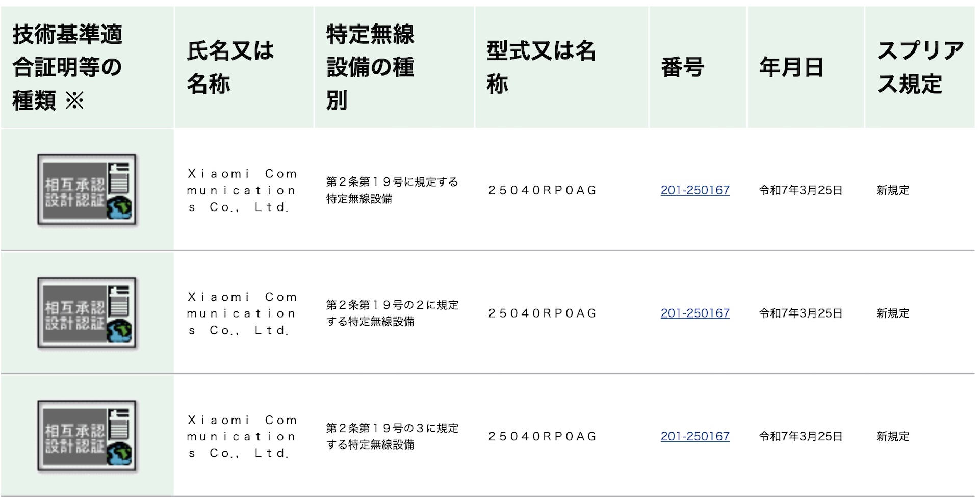 総務省が「技術基準適合証明等を受けた機器の検索」のデータベースを更新し、新たにXiaomi Communications(以下、Xiaomi)が「25040RP0AG」の電波法に基づく工事設計認証(いわゆる「技適」)を2025年3月25日(火)付けでKiwa Nederlandによって取得しています。認証番号は「201-250167」で、2.4および5GHzの無線LAN(Wi-Fi)とBluetoothのみで認証されています。