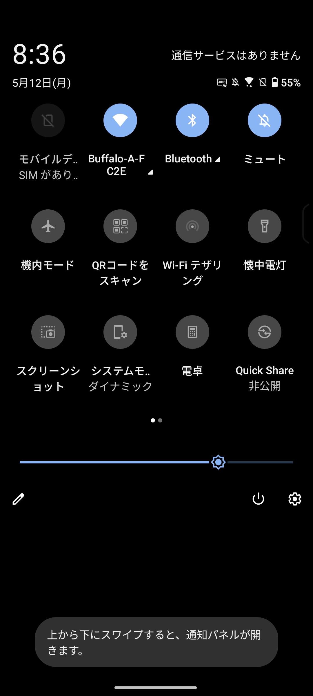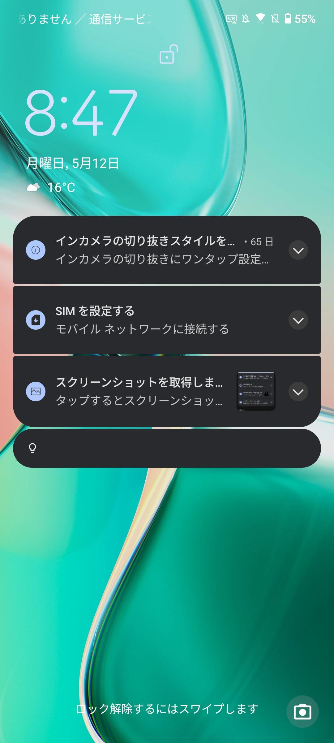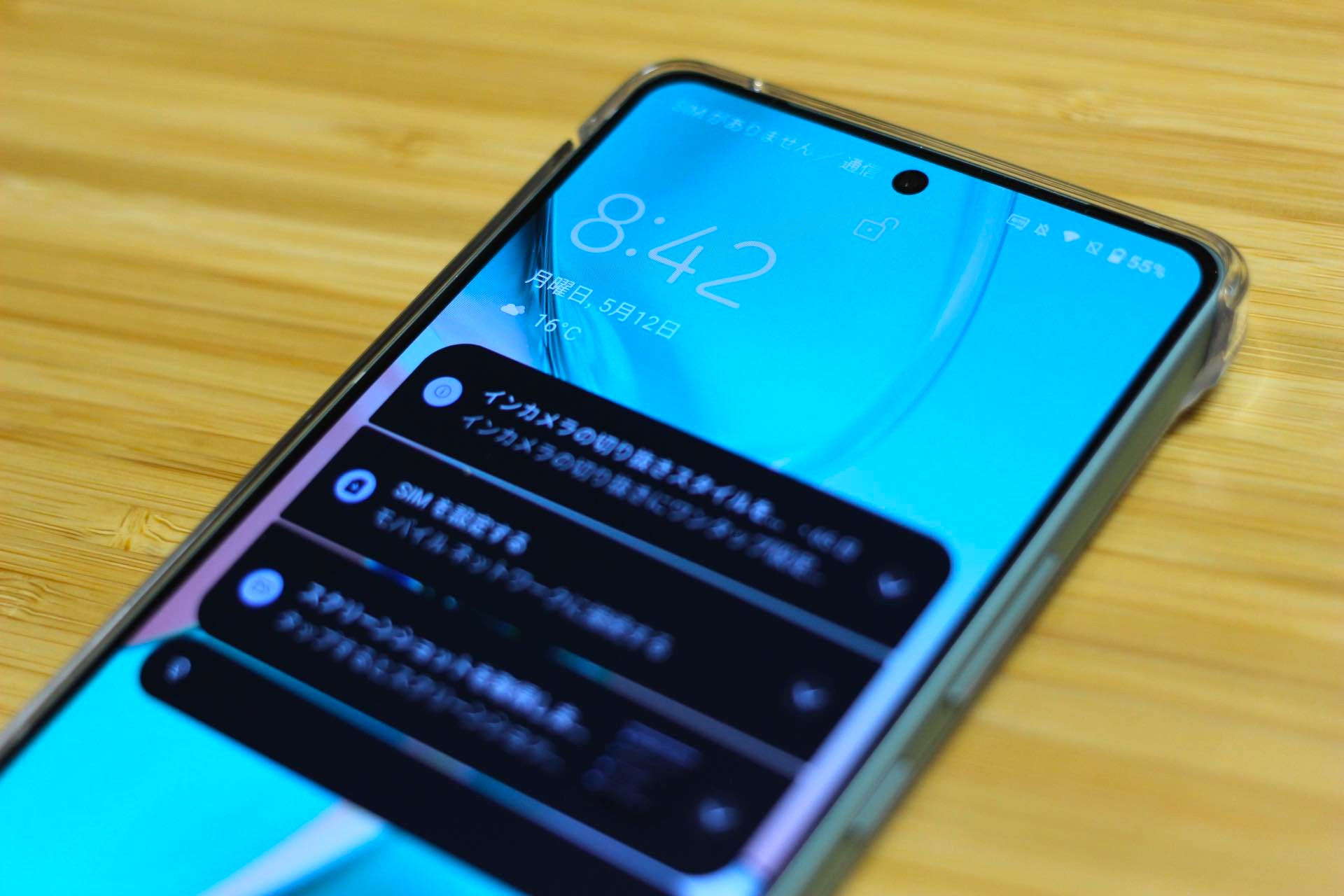 Android 15ベースのZenUI 12ではZenUI 11から最近流行りの通知とクイック設定パネルが分かれているタイプとなっており、上辺の左側半分を下にスワイプで通知、右半分を下にスワイプでクイック設定パネルが表示されます。ただし、他社にあるような通知とクイック設定パネルを左右のスワイプで切り替える操作には対応していません