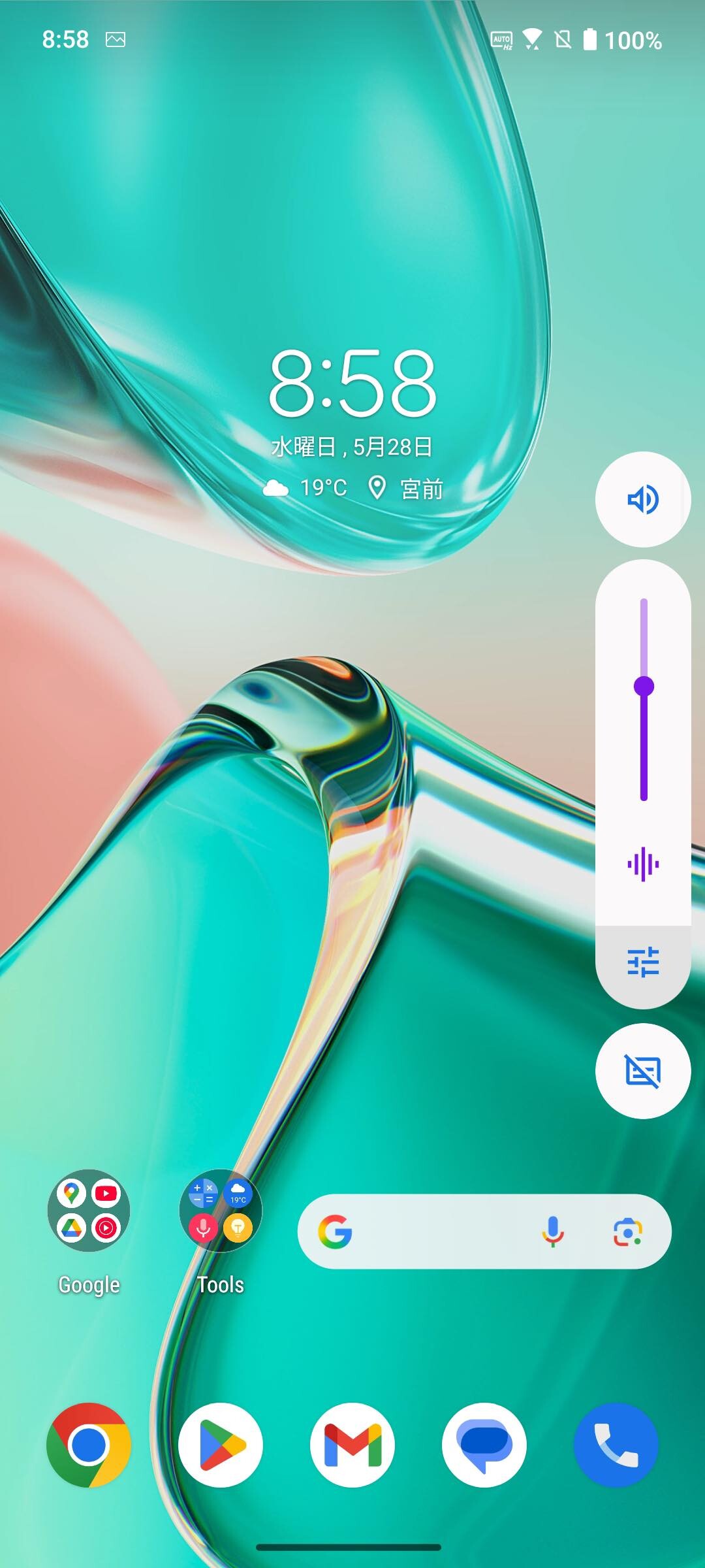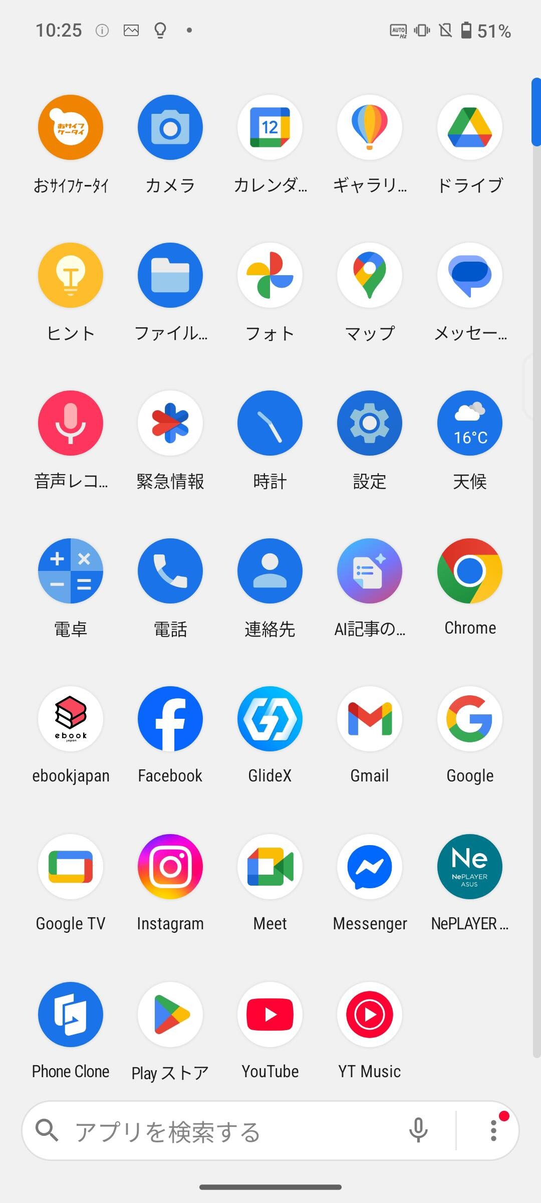 音量調節バーとアプリ一覧(ドロワー)。プリインストールされているアプリではおサイフケータイ アプリやおサイフケータイ 設定アプリ、おサイフケータイ Webプラグインセットアップ、Google ドライブ、Device configuration、ebookjapan、Facebook、Google TV、Instagram、Messenger、NePLAYER for ASUSあたりがアンインストールが可能