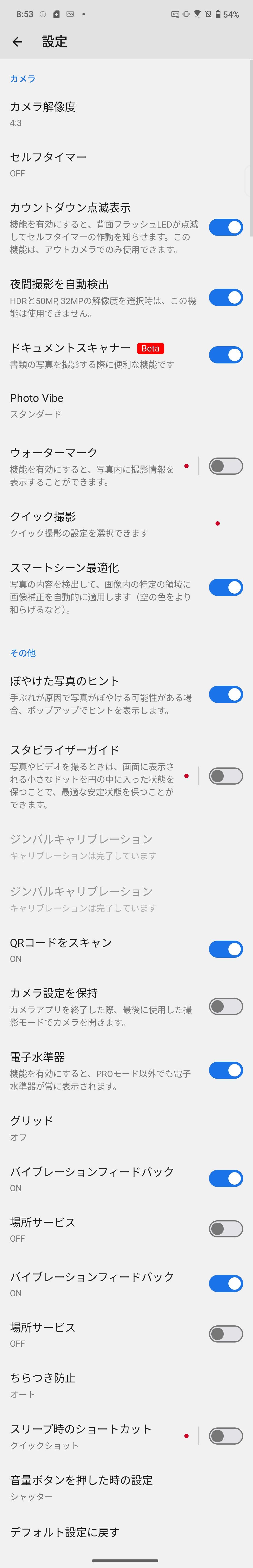 標準カメラアプリのファインダー画面。モードは「写真」の他に「動画」や「ポートレート動画」、「AIトラッキング」、「ポートレート」、「AI流し撮り」、「PROモード」、「夜景」、「パノラマ」、「ライトトレイル」、「PROビデオ」、「スローモーション」、「タイムラプス」が用意。右は簡易設定画面で、この歯車ボタンから詳細な設定が行えます