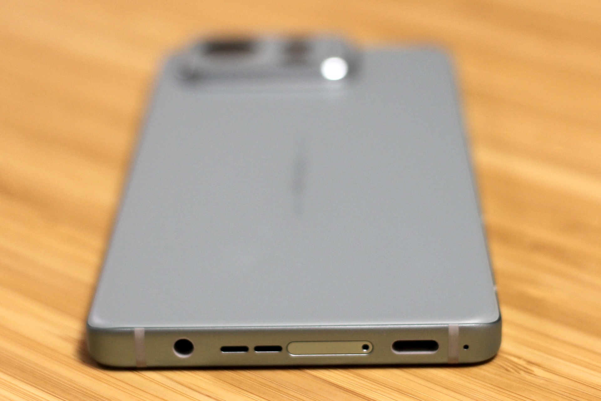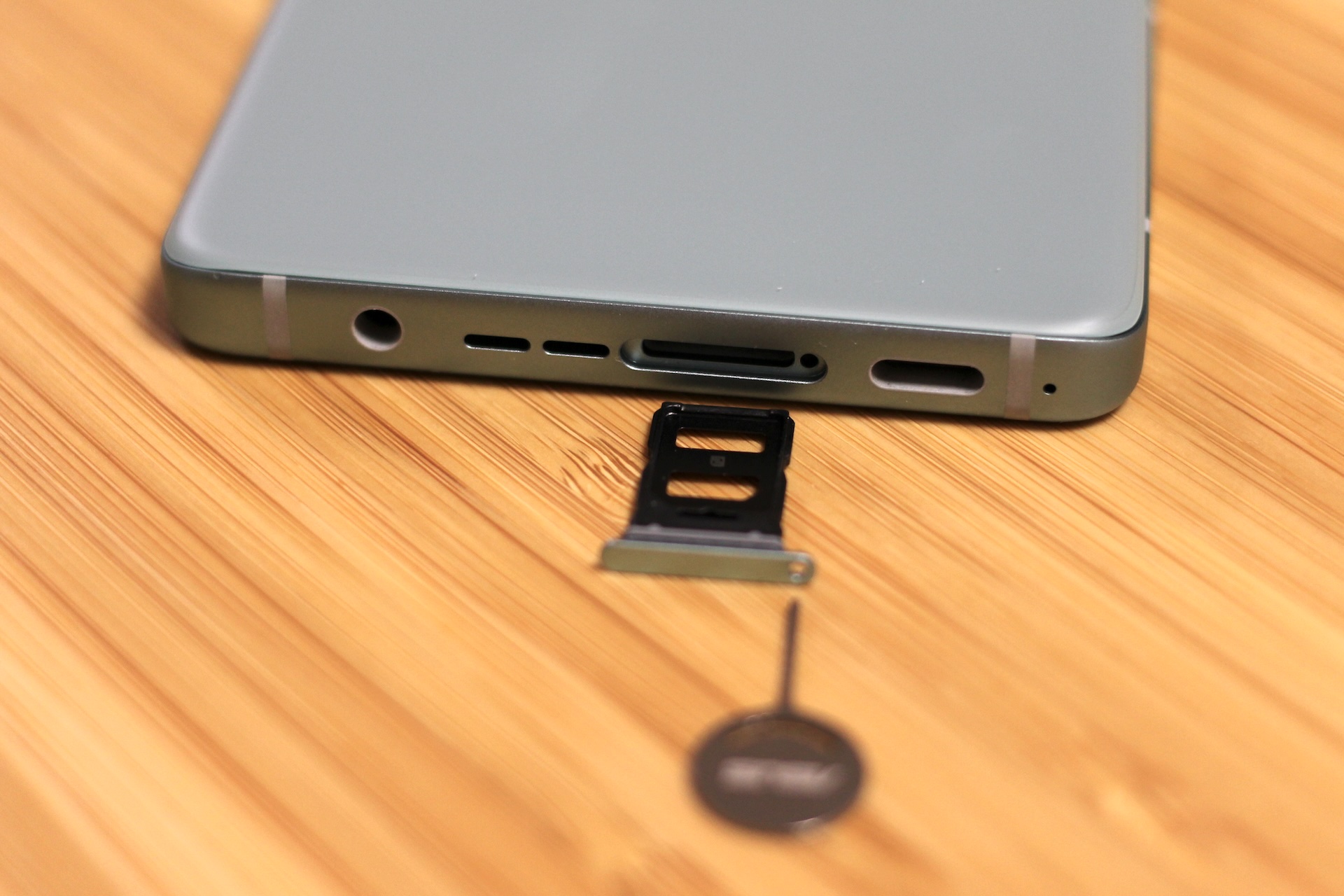 Zenfone 12 Ultraの上下側面。上側にはサブマイクと外部スピーカー、3.5mmイヤホンマイク端子、下側には通話用メインマイクとnanoSIMカード(4FF)カードスロット、USB Type-C端子(USB 2.0)、外部スピーカーが配置。Zenfone 11 Ultraと同様にROG Phoneシリーズとベースが同じである影響からUSB Type-C端子が中央ではなく端に寄っているのが特徴に