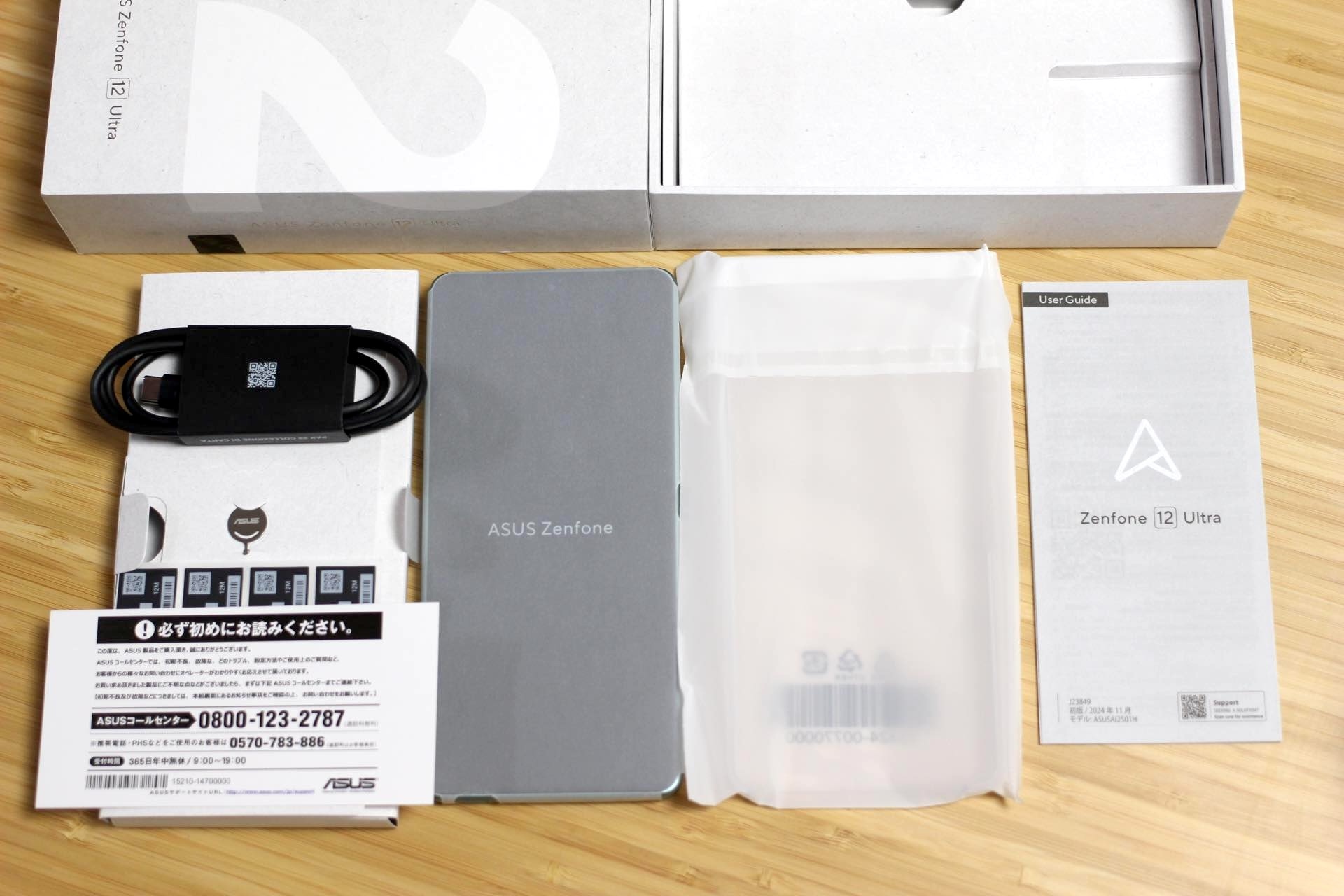 パッケージ(箱)はZenfone 11 Ultraなどと同様にグレーを基調としており、上面には「ASUS Zenfone 12 Ultra」とASUSの30周年を記念した新しいロゴ「Aモノグラム」が記載され、側面や背面に製品製造番号や本体色、型番などが記載されています。なお、今回紹介するのは新色のセージグリーンで、上位モデルの16GB RAM+512GBストレージです。箱を開けると、まずは保護ケースや説明書などの紙類が収納されたスリーブケースが現れ、スリーブケースの下にZenfone 12 Ultraの本体があり、さらにその下にUSBケーブルが収納されています。